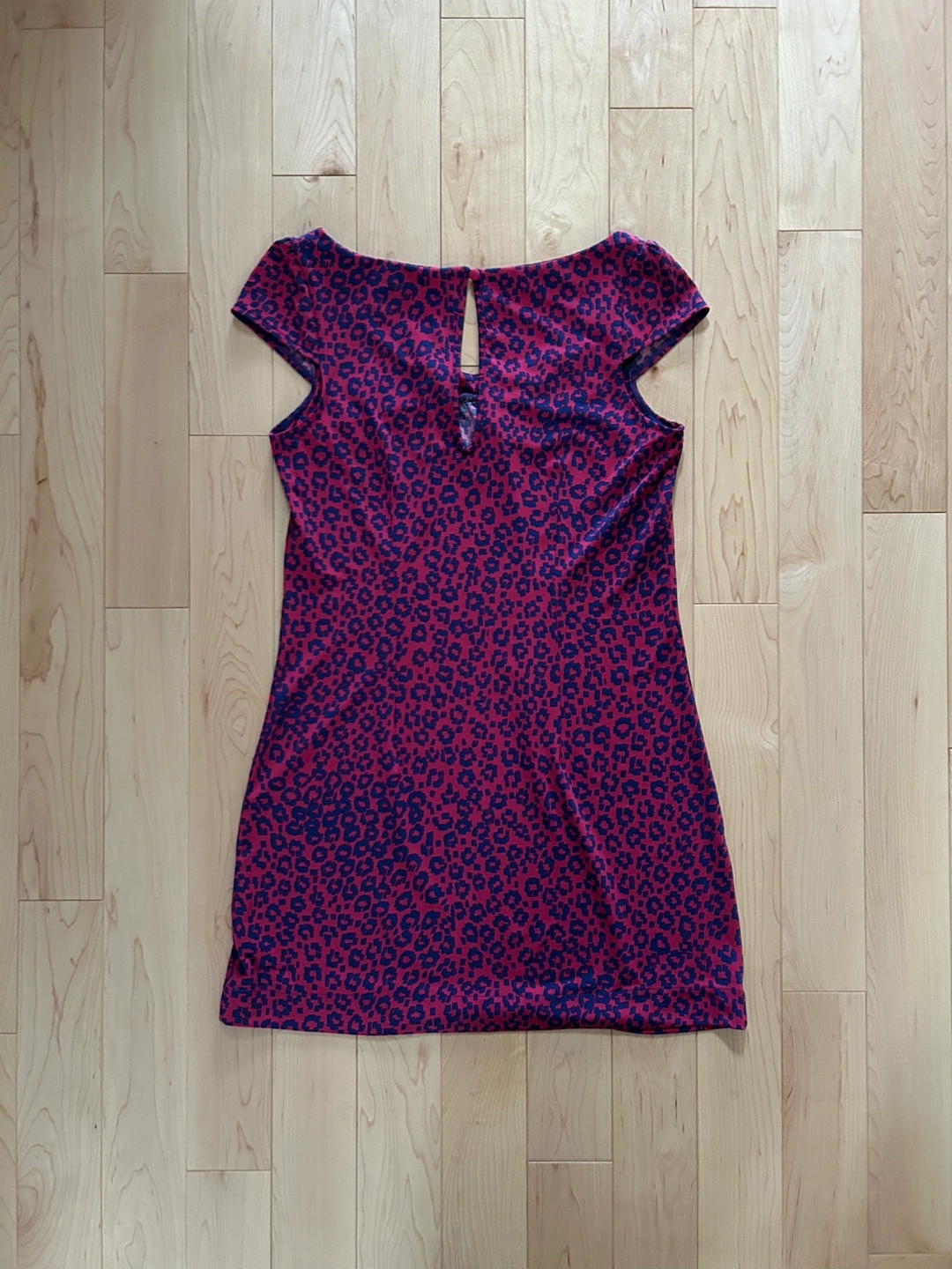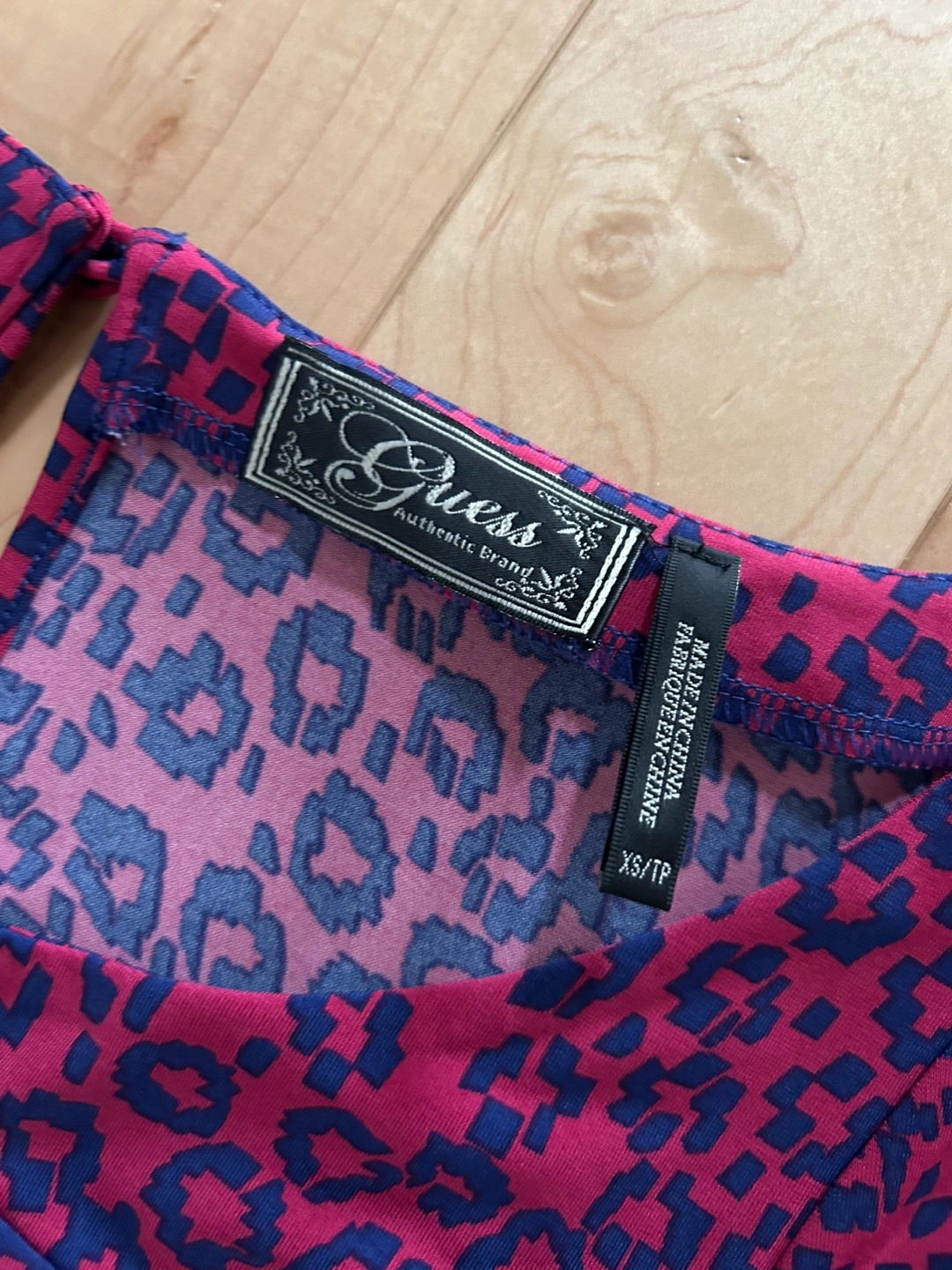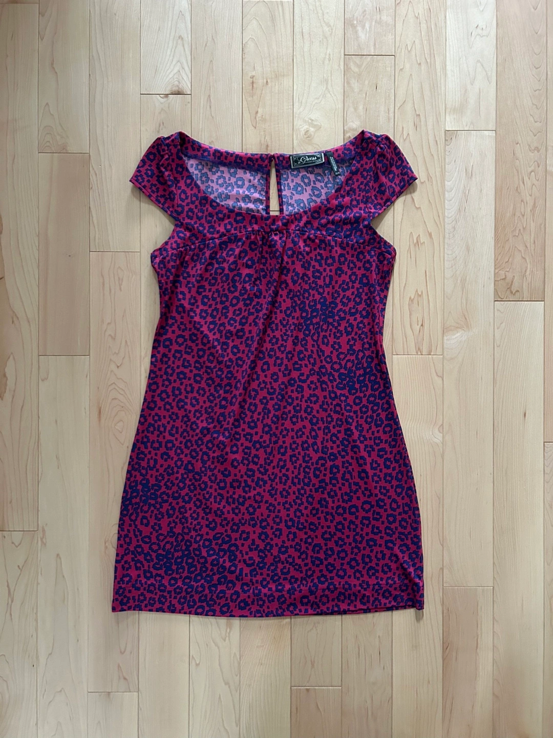 Brand: Guess Description: Scoop neck cap sleeve dress in hot pink with purple pattern print. Front smocked yoke detail and keyhole button closure at back. Size: XS (worn by a true size Small in photo) Content: 92% polyester / 8% spandex, made in China Condition: Excellent, like new Porch or door pick-up near Taunton/Audley in Ajax, ON
