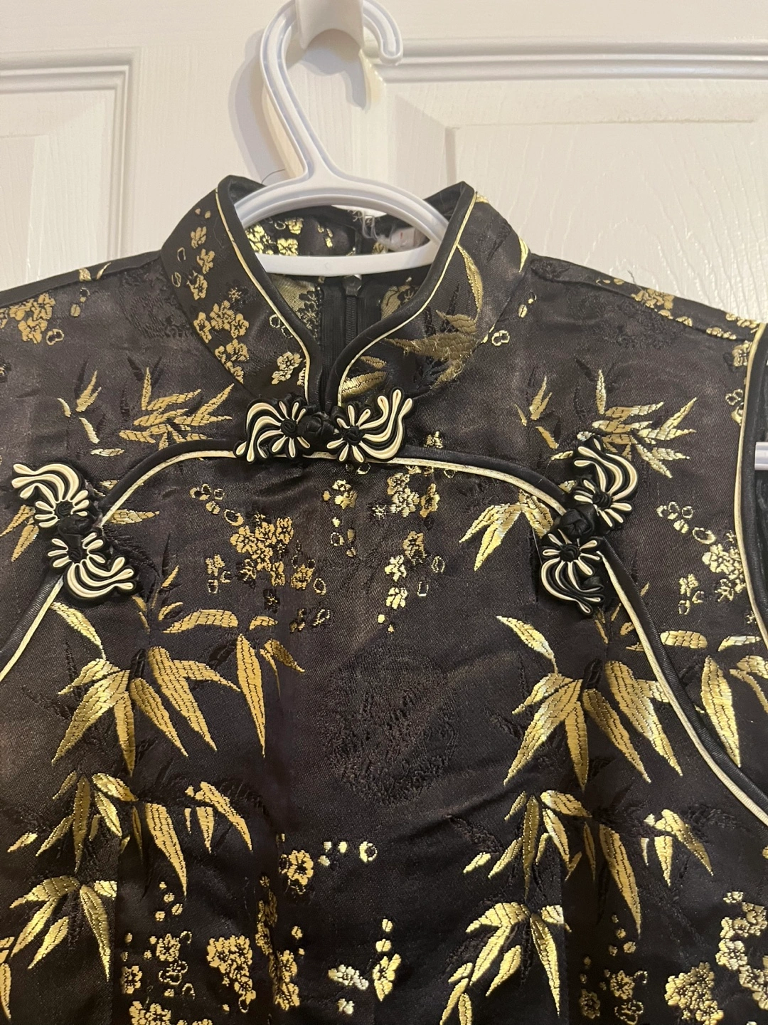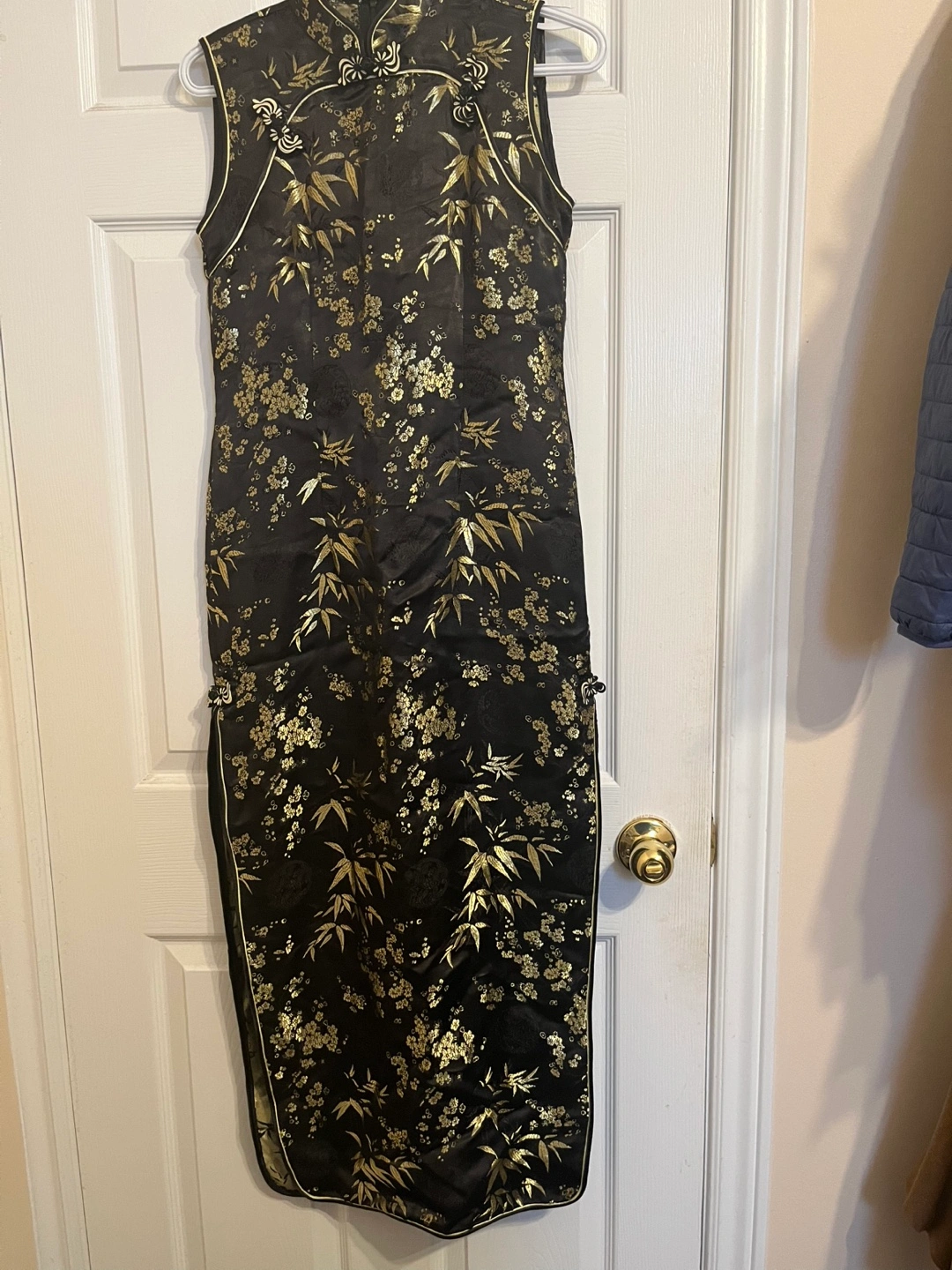 Sleeveless cheongsam dress with gold floral and bamboo print. Has a mandarin collar and side slits. Fits size US 2