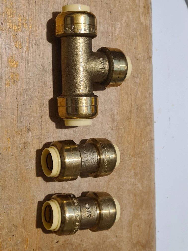 Brass push to connect fittings. Includes one tee and two straight connectors.