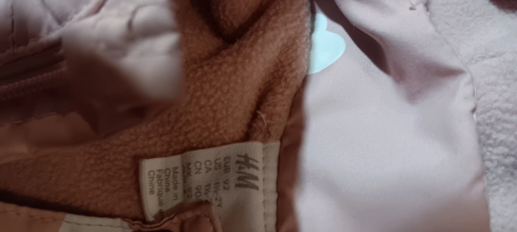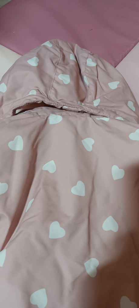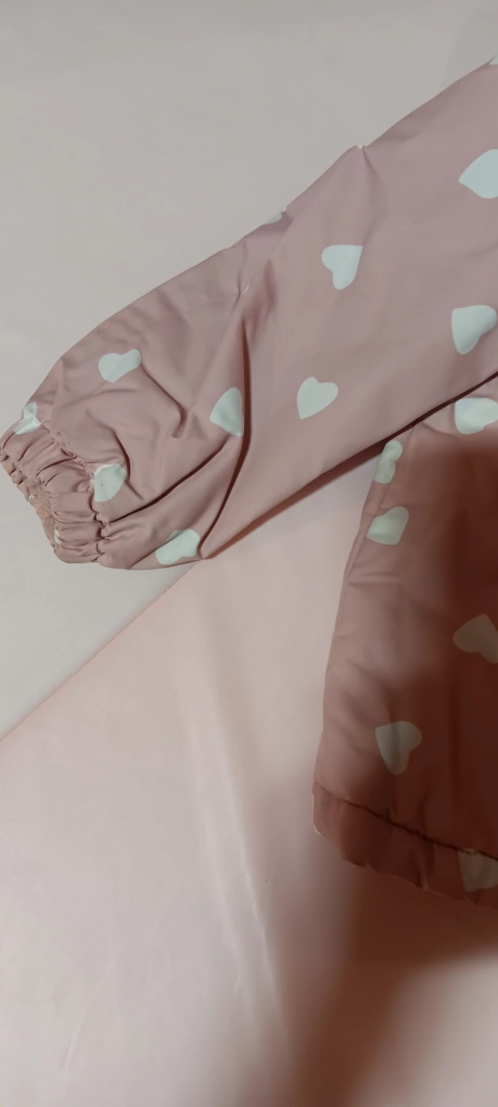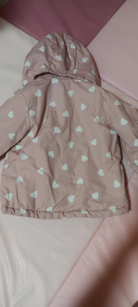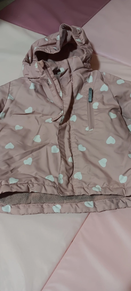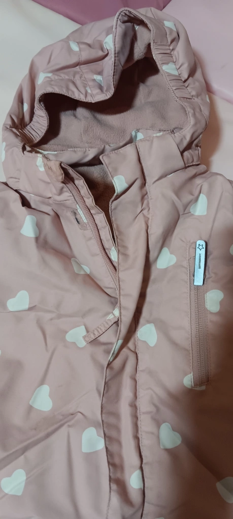 Pink winter jacket with white hearts. Has a hood and a zipper closure.