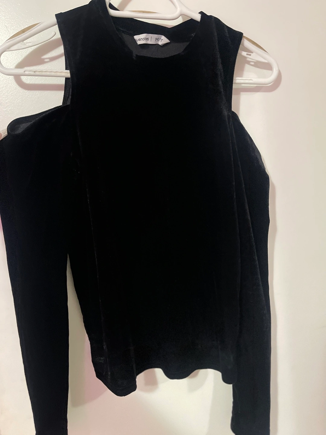 Long sleeve black velvet top with cut shoulder detail. Round neckline.