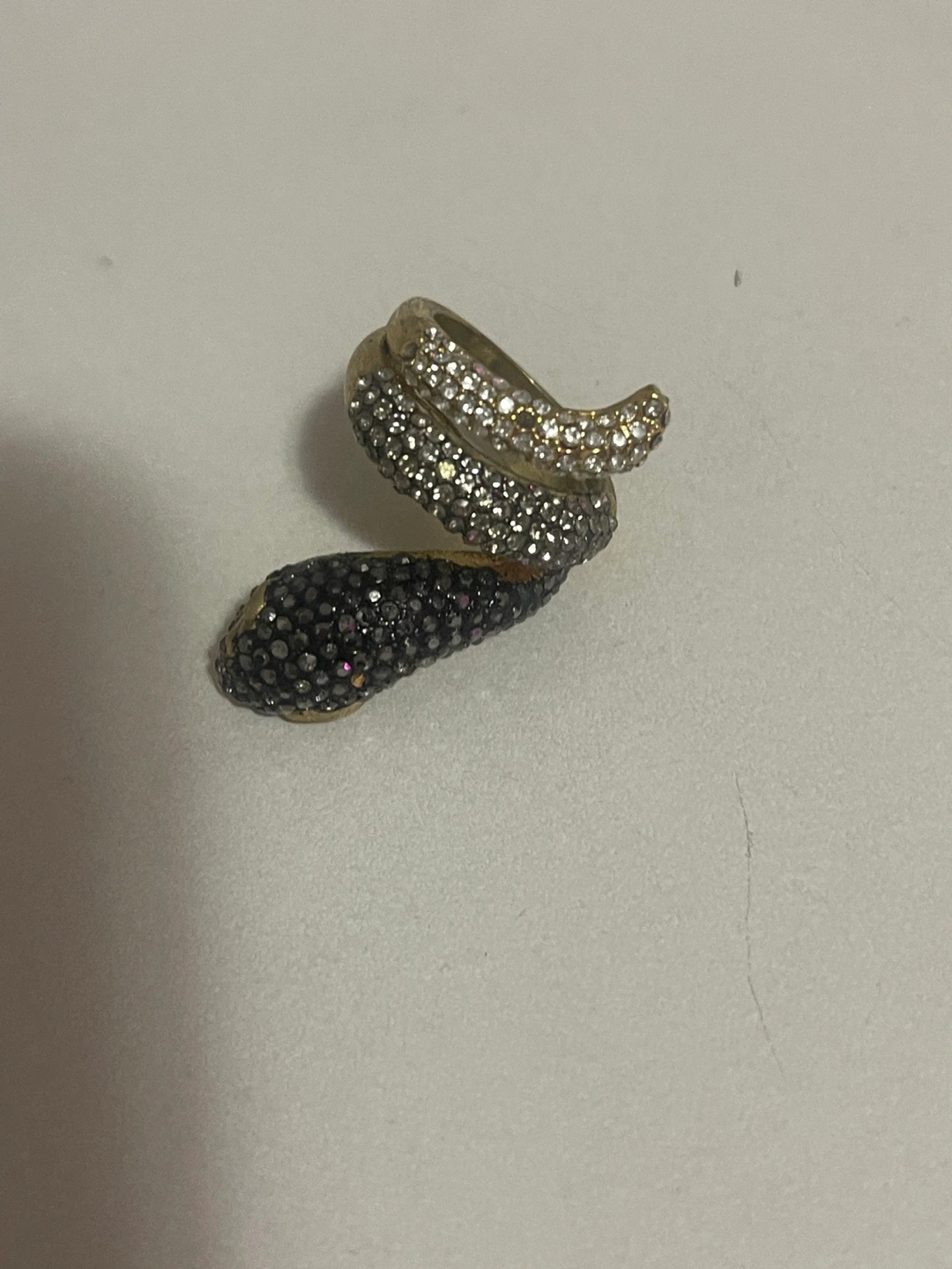 Gold tone ring with black and white rhinestones. Snake design. Size 7.