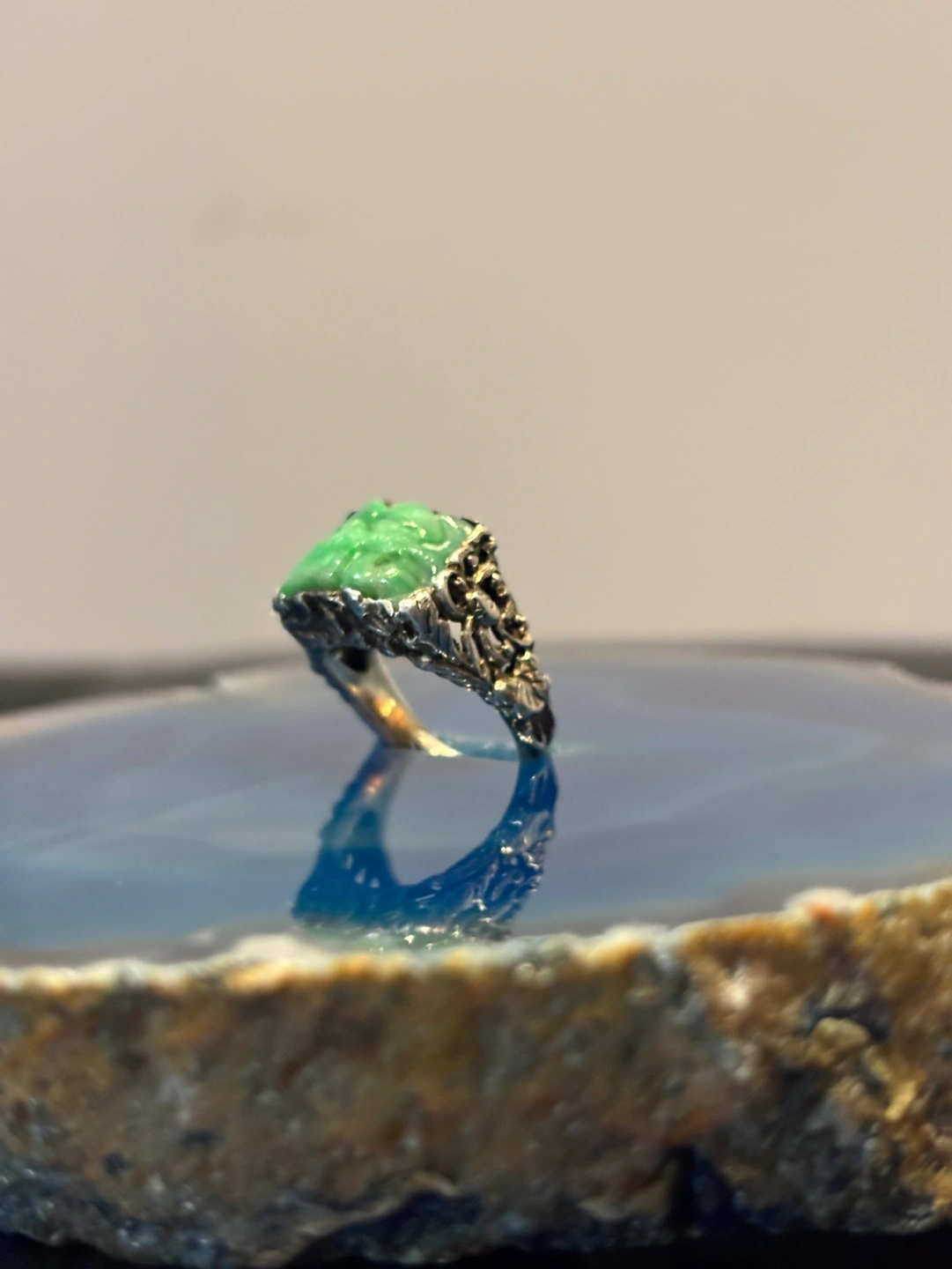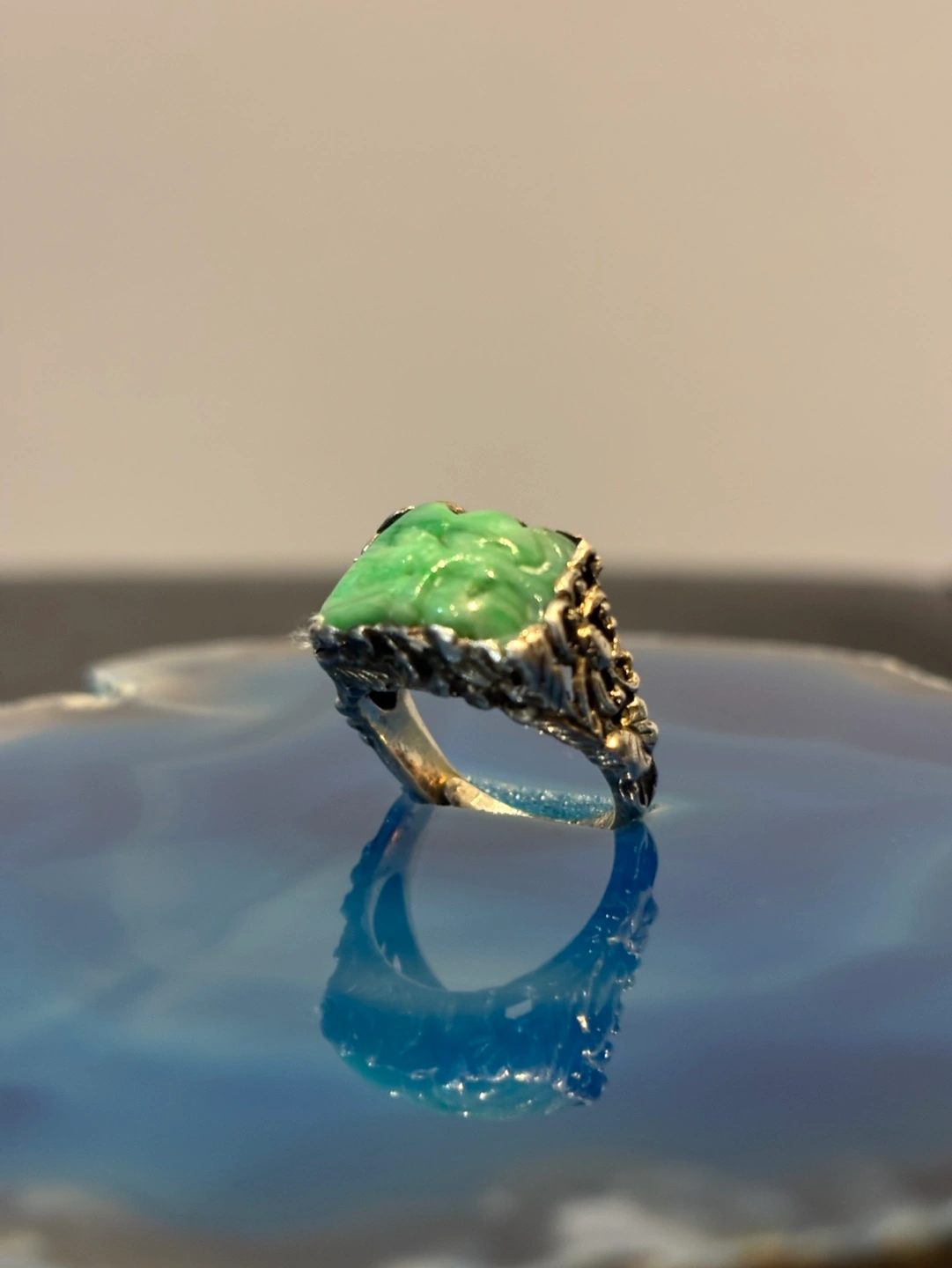 Vintage ring with a green jade stone, set in silver. The ring features an intricate design with detailed carvings.