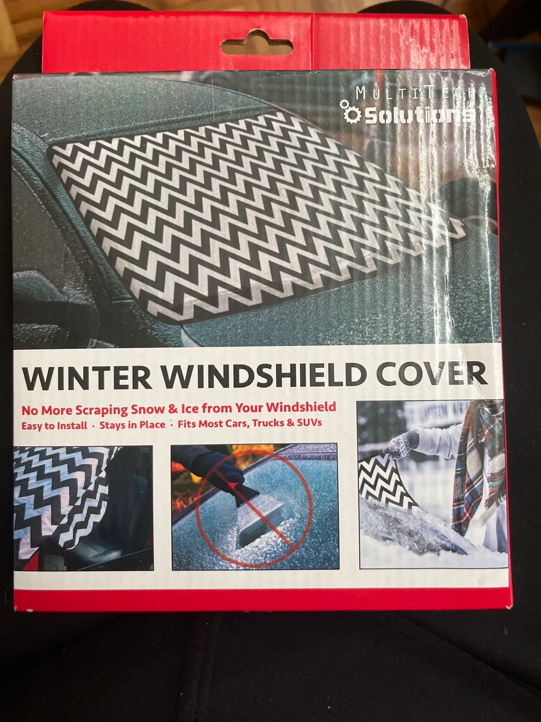 No more scraping snow and ice from your windshield. Easy to install, stays in place, fits most cars, trucks, and SUVs. Black and white zig zag pattern. - OPEN TO OFFER -