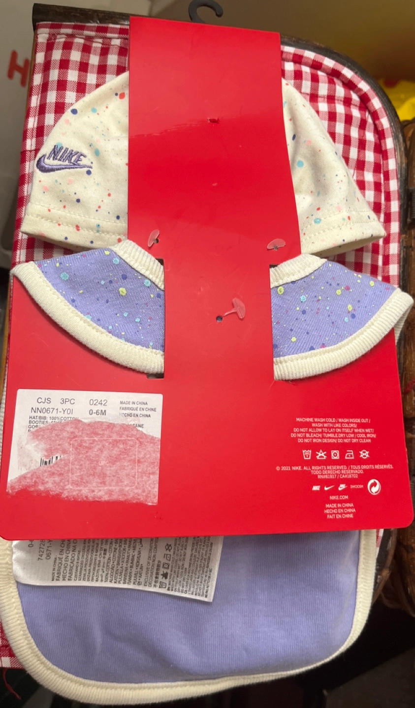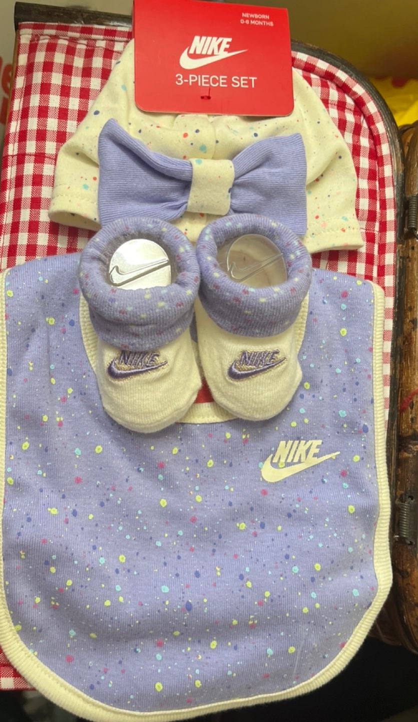 Newborn baby set includes a hat, bib, and booties. Features a purple base with multicoloured speckles and a white Nike logo. - OPEN TO OFFERS -