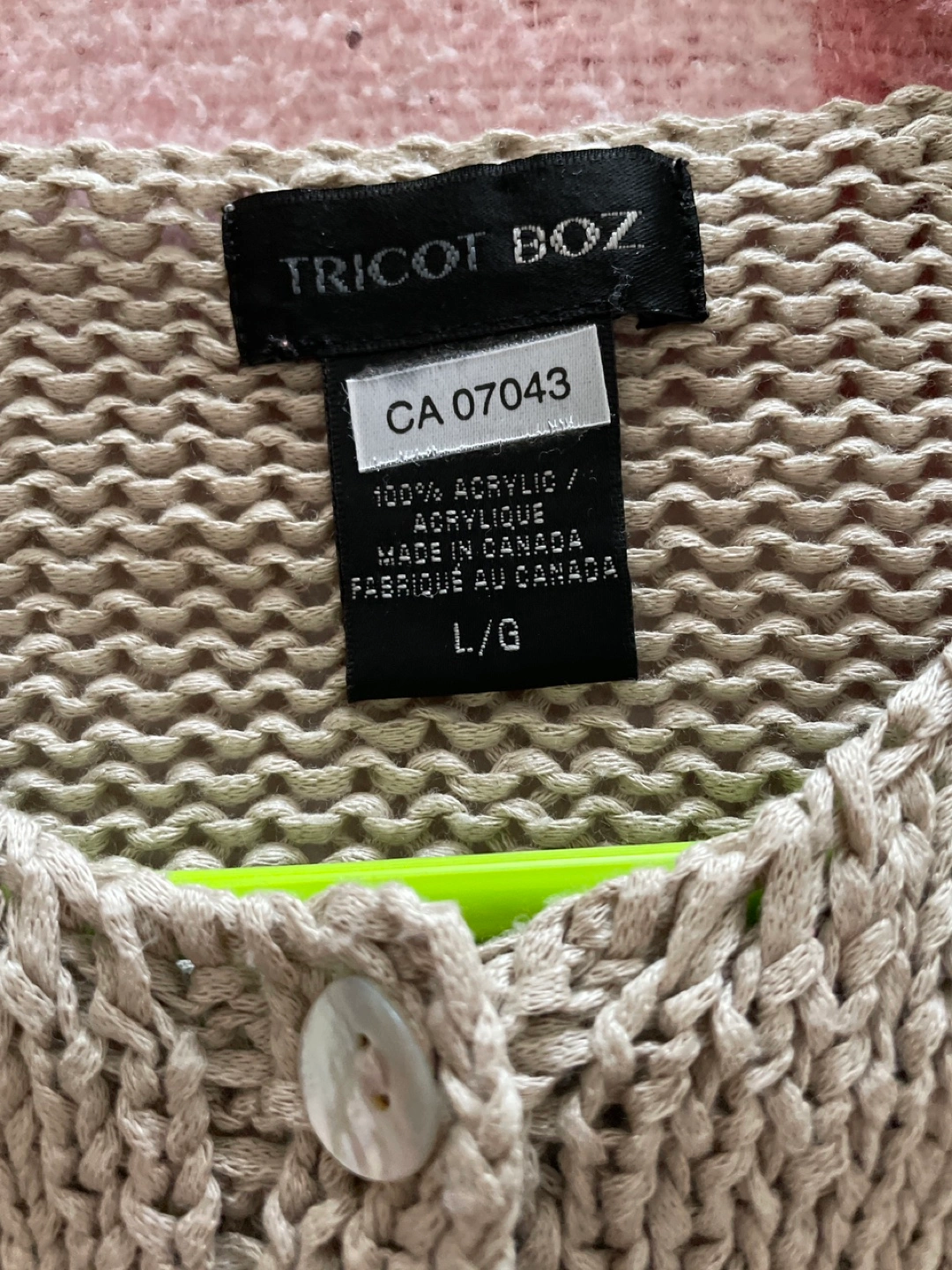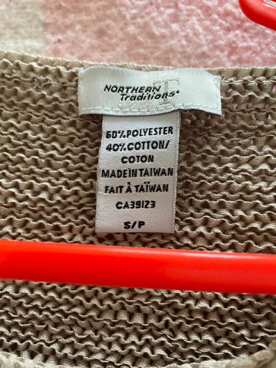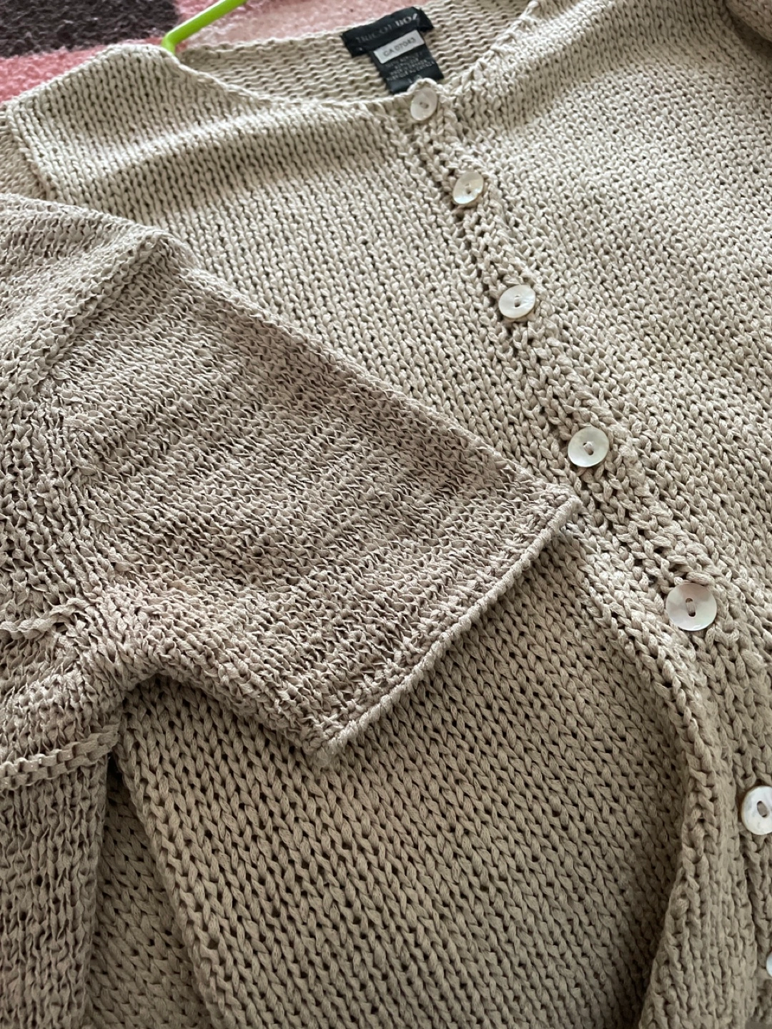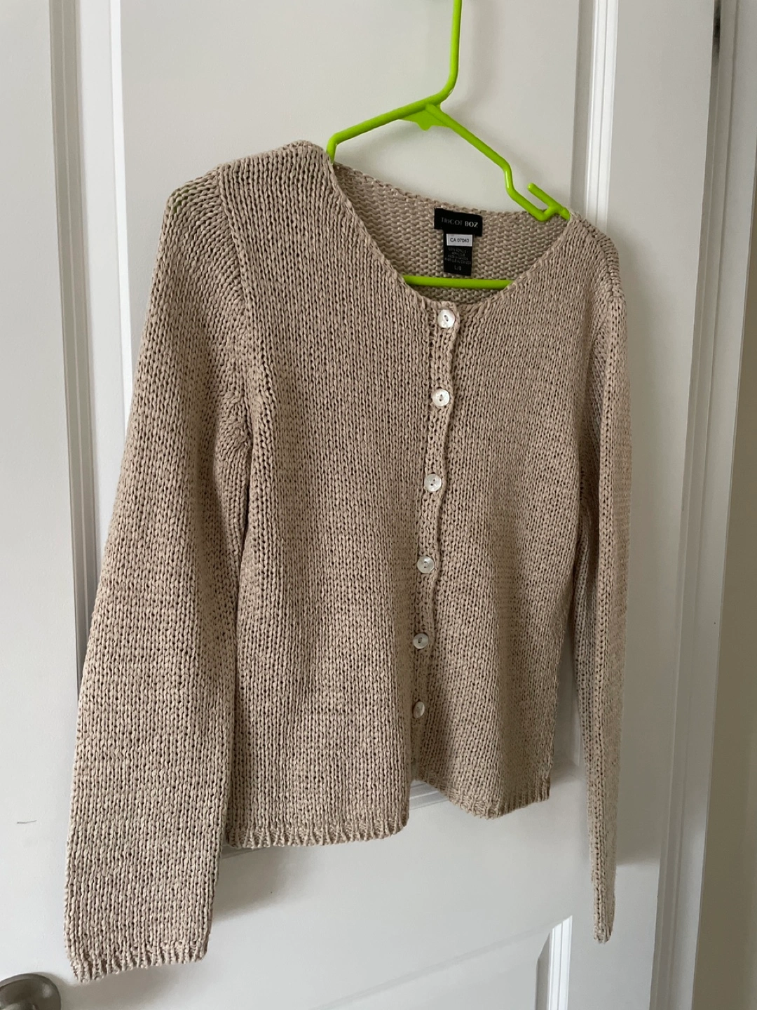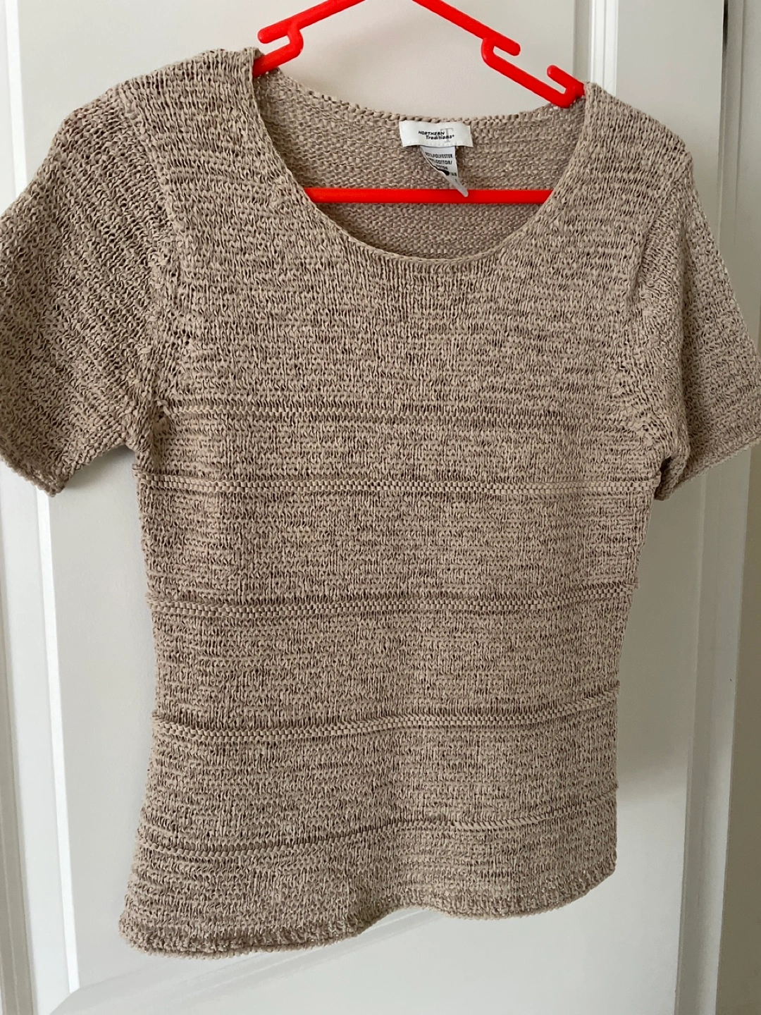 Tan knit cardigan and top set. Long-sleeved cardigan with buttons. Short-sleeved top. Smoke free and pet free home