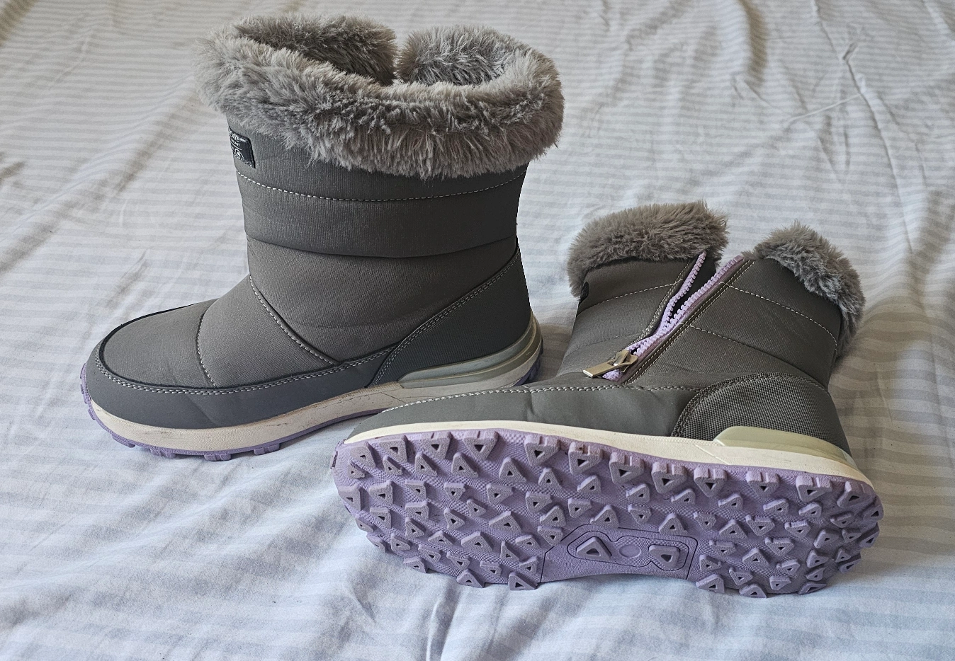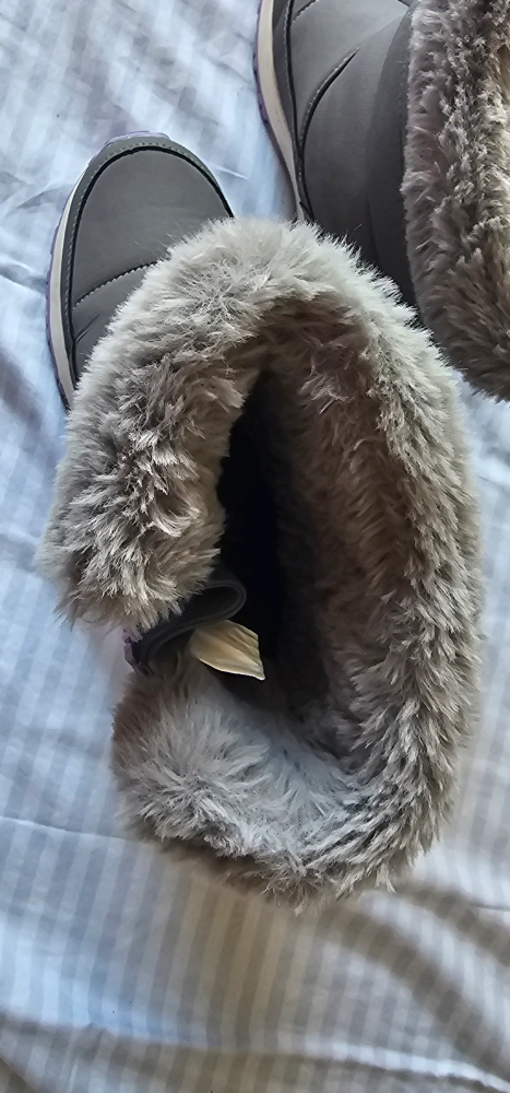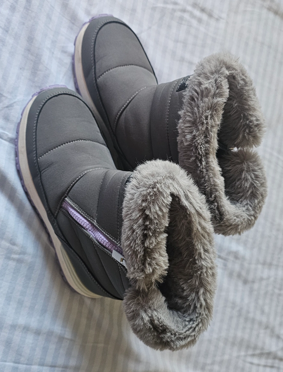 Gray winter boots with purple accents. Size 5. Faux fur lining. Zip up closure. Great condition.
