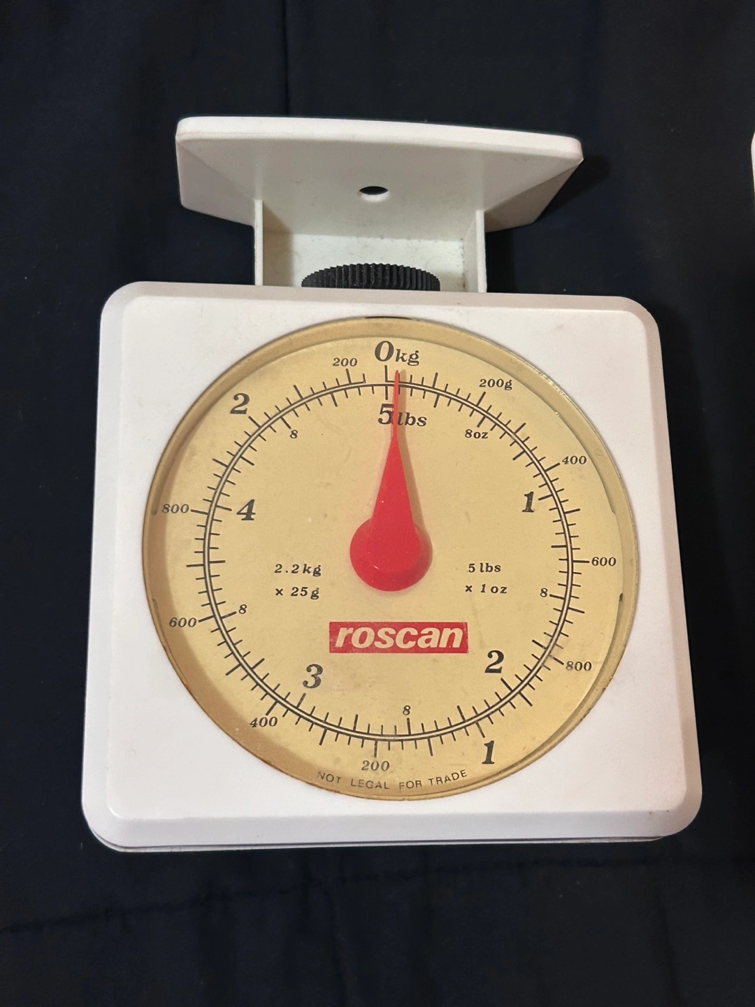 White kitchen scale. Measures up to 5 lbs. Works well