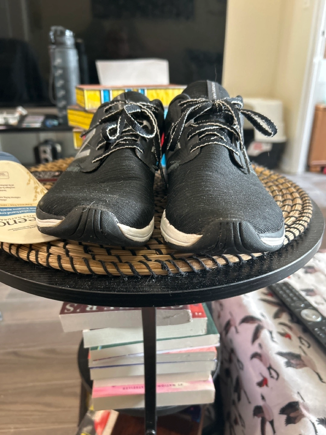 Black running shoes with white soles. Lace-up style. Good condition. Size 7