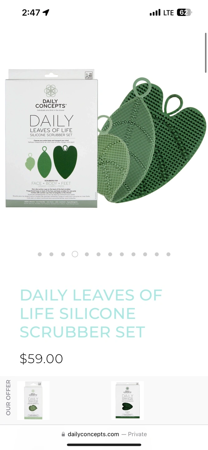 Set of three silicone scrubbers in leaf shapes for face, body, and feet. Non-slip suction cups on the back for easy grip.