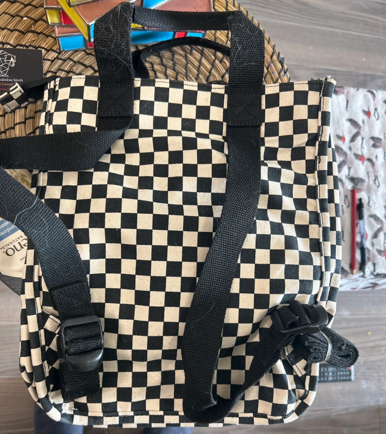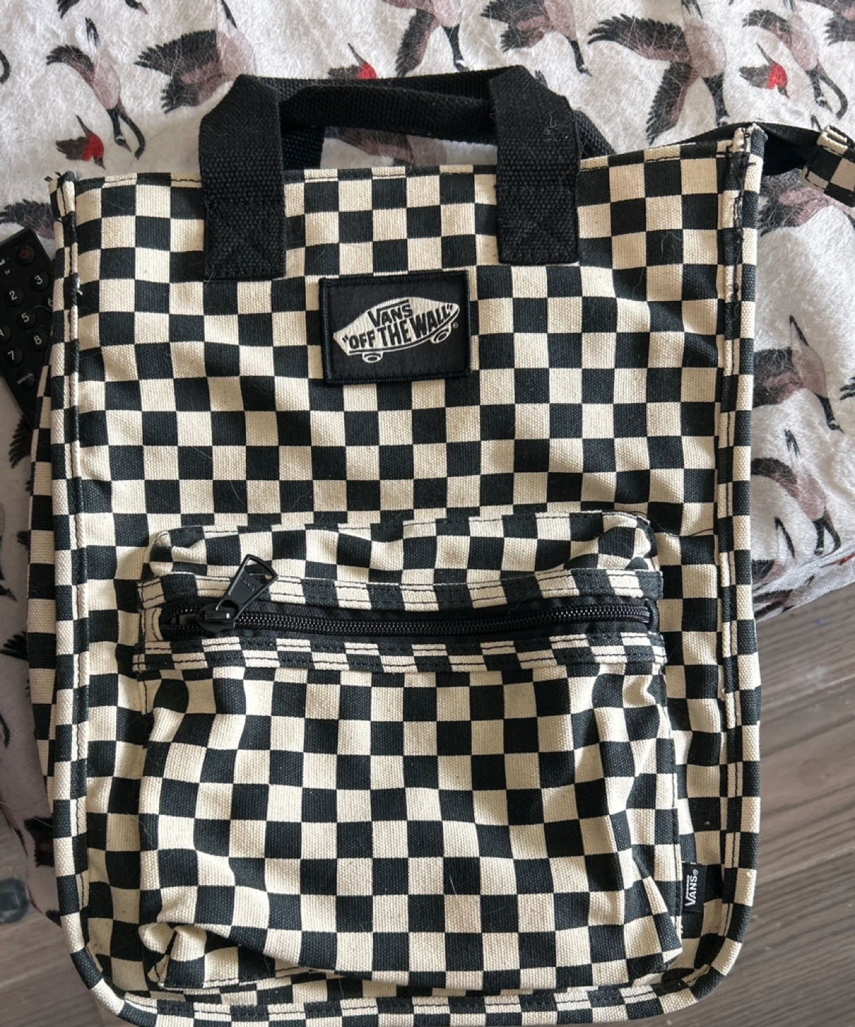 Black and white checkered backpack with adjustable straps. Features a zippered pocket on the front. Excellent condition. Never used this, so I would love if someone could help take it off my hands!
