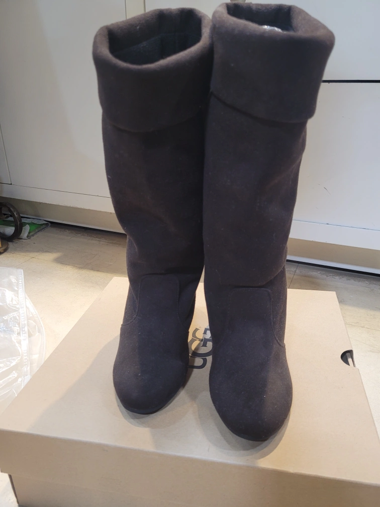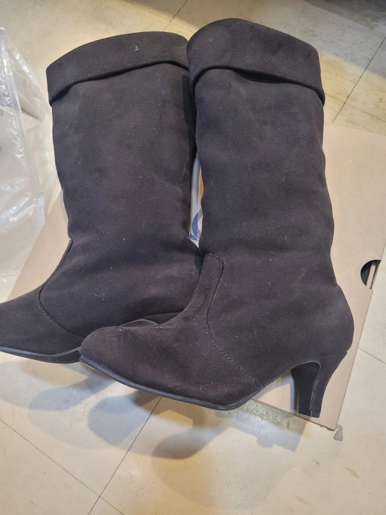 Black suede boots with a low heel. In good condition.