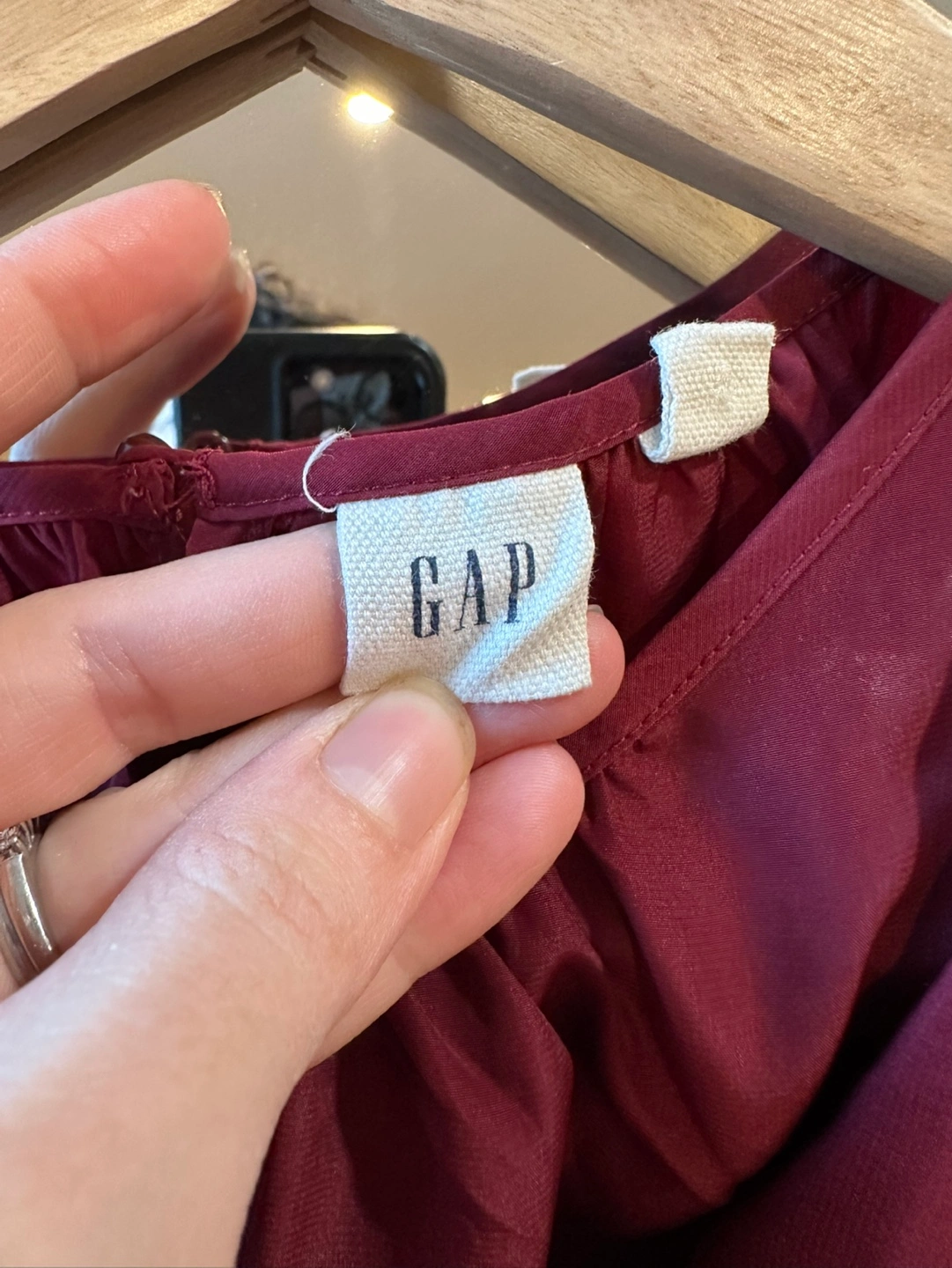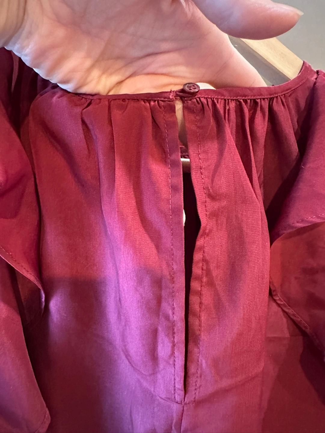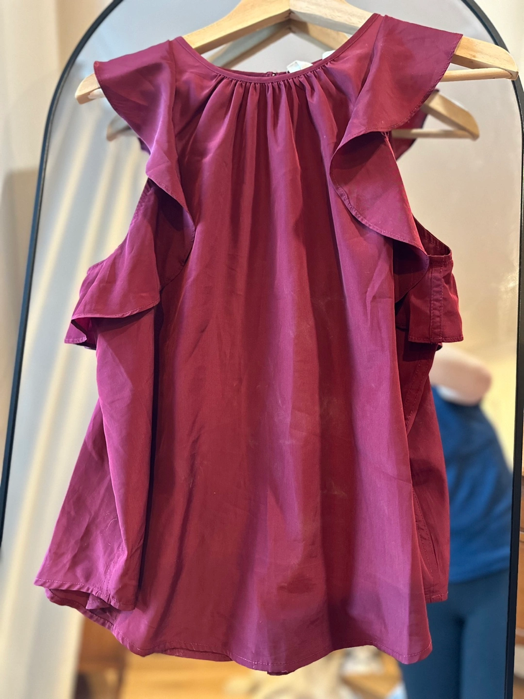 Burgundy sleeveless blouse with ruffles on the shoulders. Size small. CASH ONLY please and thank you.