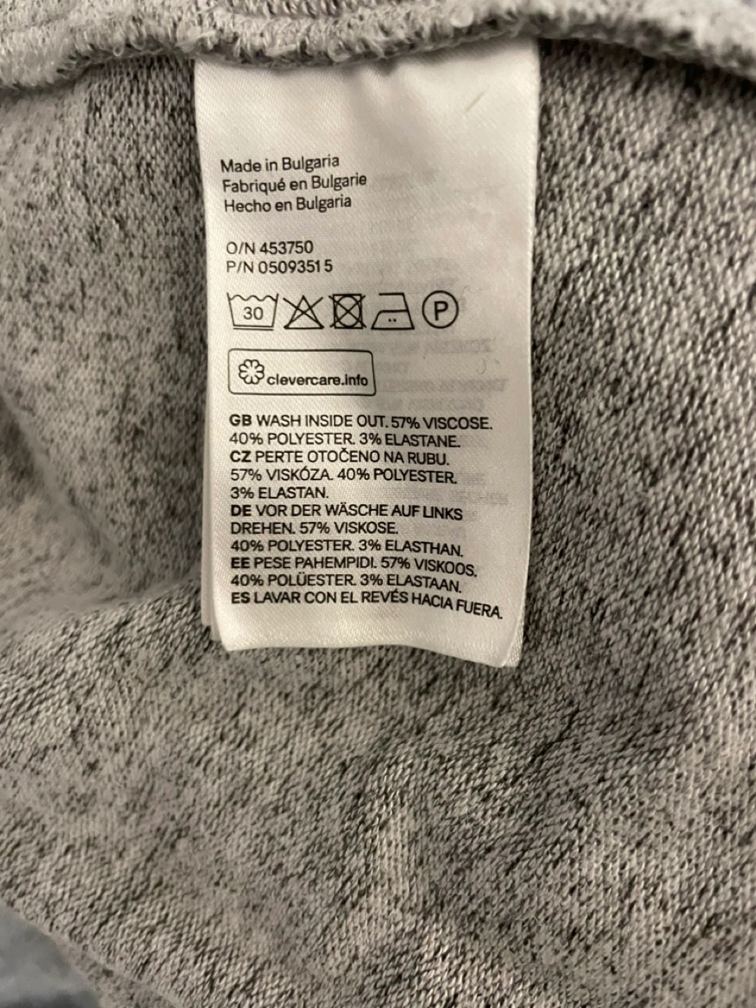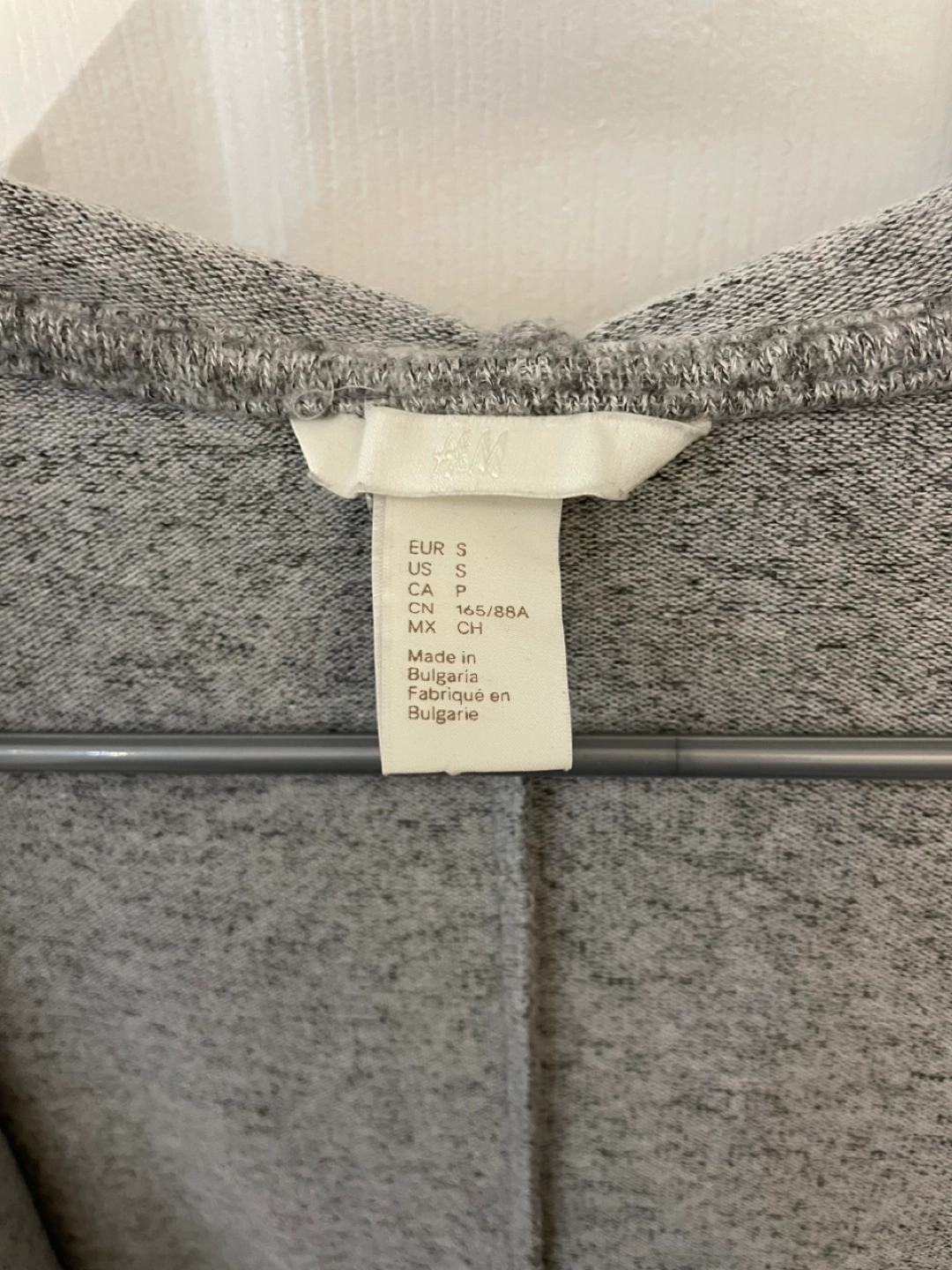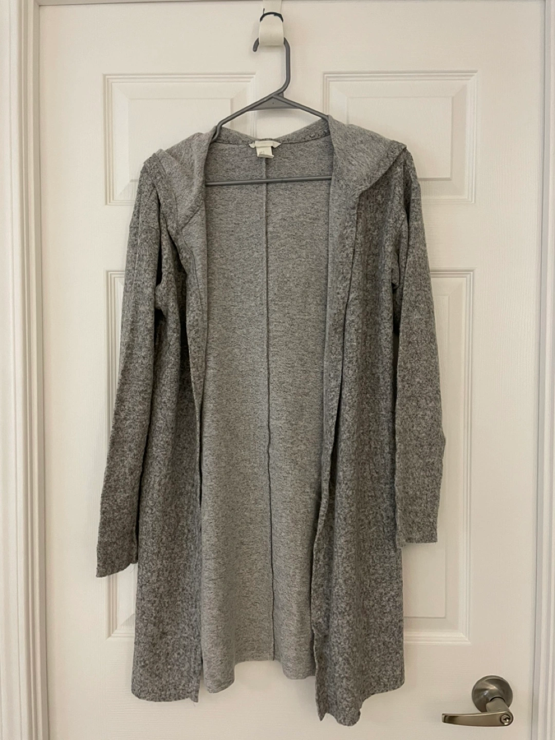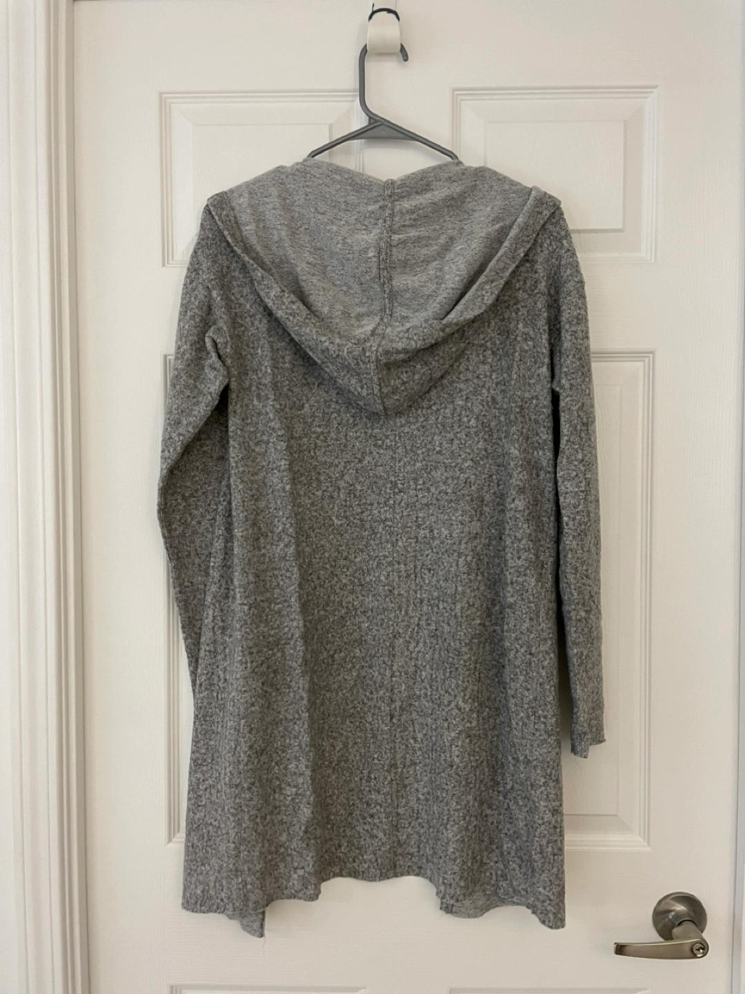 Long sleeve grey cardigan with a hood. Open front. 57% viscose, 40% polyester, 3% elastane. From a pet-free, smoke-free home.