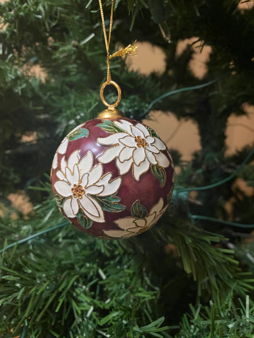 Round ornament with white flowers and green leaves on a maroon background. Gold trim.