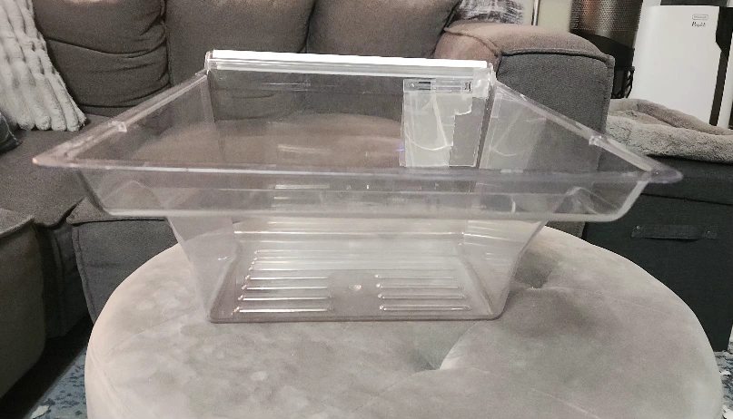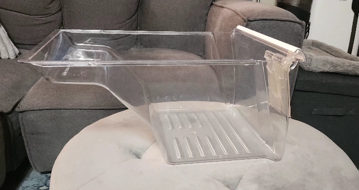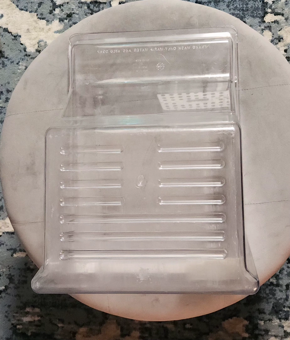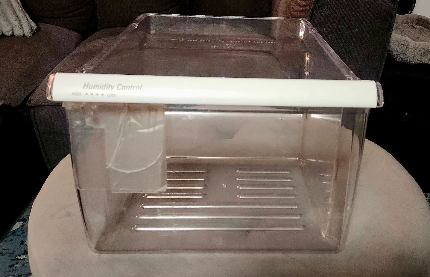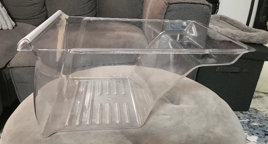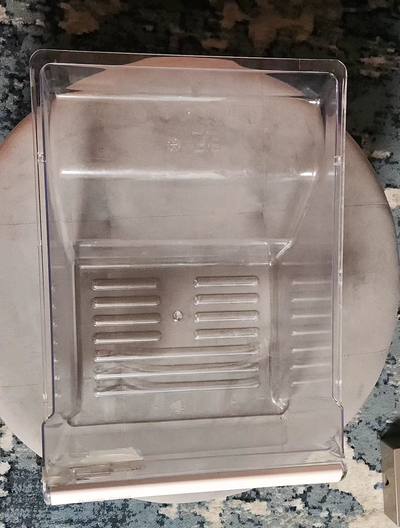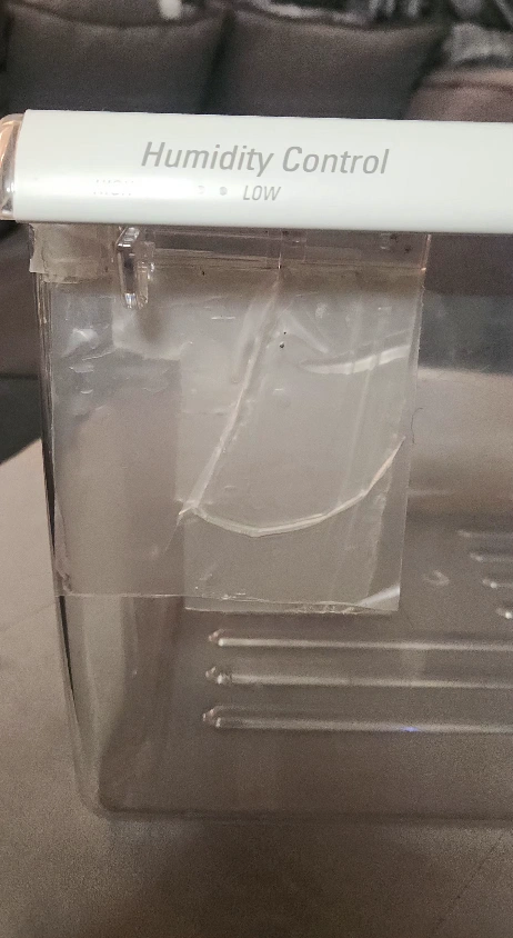 Clear plastic crisper drawer with white plastic handle and humidity control slider for Whirlpool fridges. Measures approximately 9" high, 18.5" deep and 13.25" wide. Original part had a crack that was repaired with Gorilla waterproof tape which makes the drawer totally functional. However, you could also remove the tape and repair the crack with epoxy glue if you prefer. Also selling other fridge parts. Just ask!