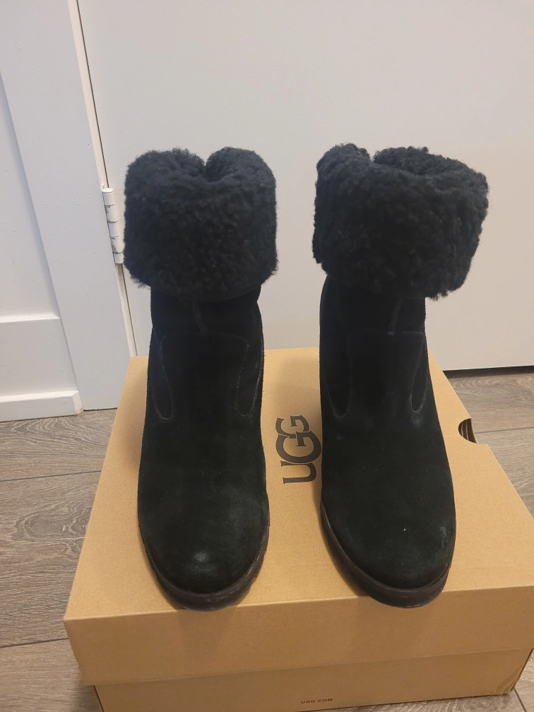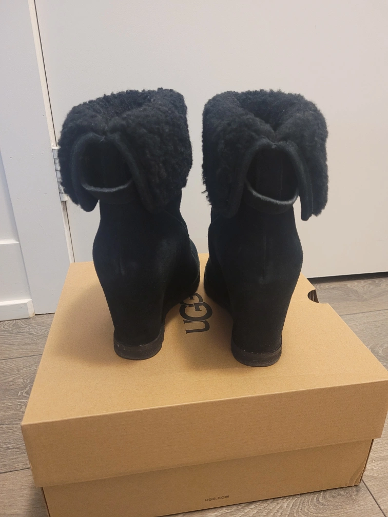 Black suede wedge boots with a fold-over cuff. Size 7. Comes in original box.