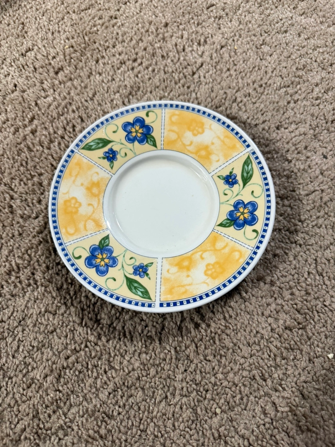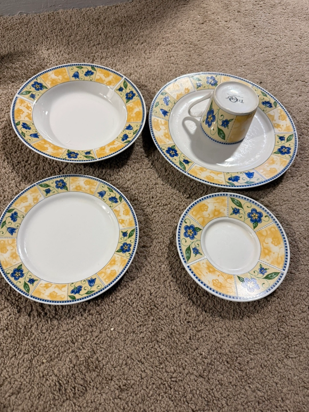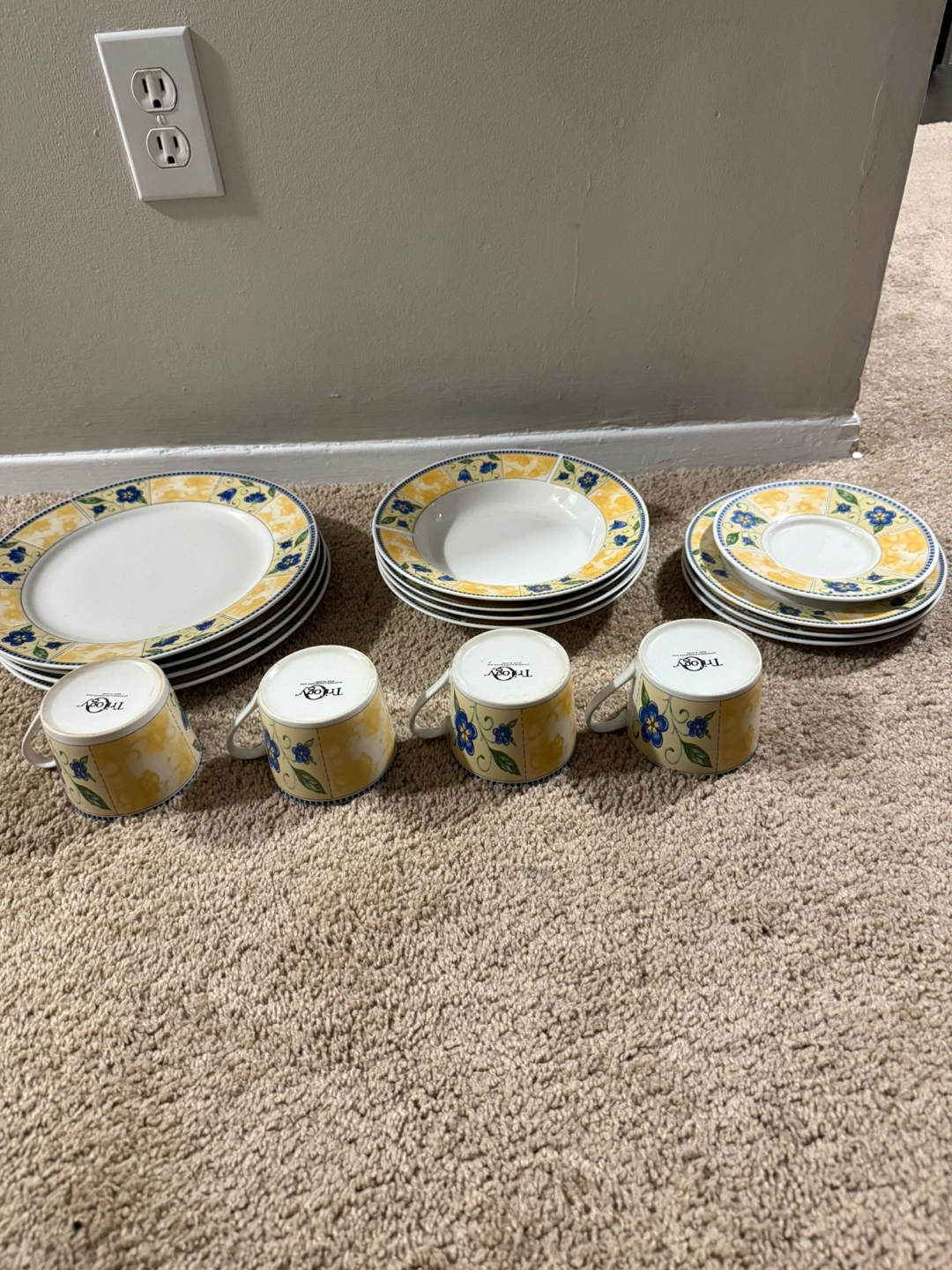 Set includes 4 dinner plates, 4 soup bowls, 3 saucers, and 4 mugs. Features a yellow and blue floral pattern.