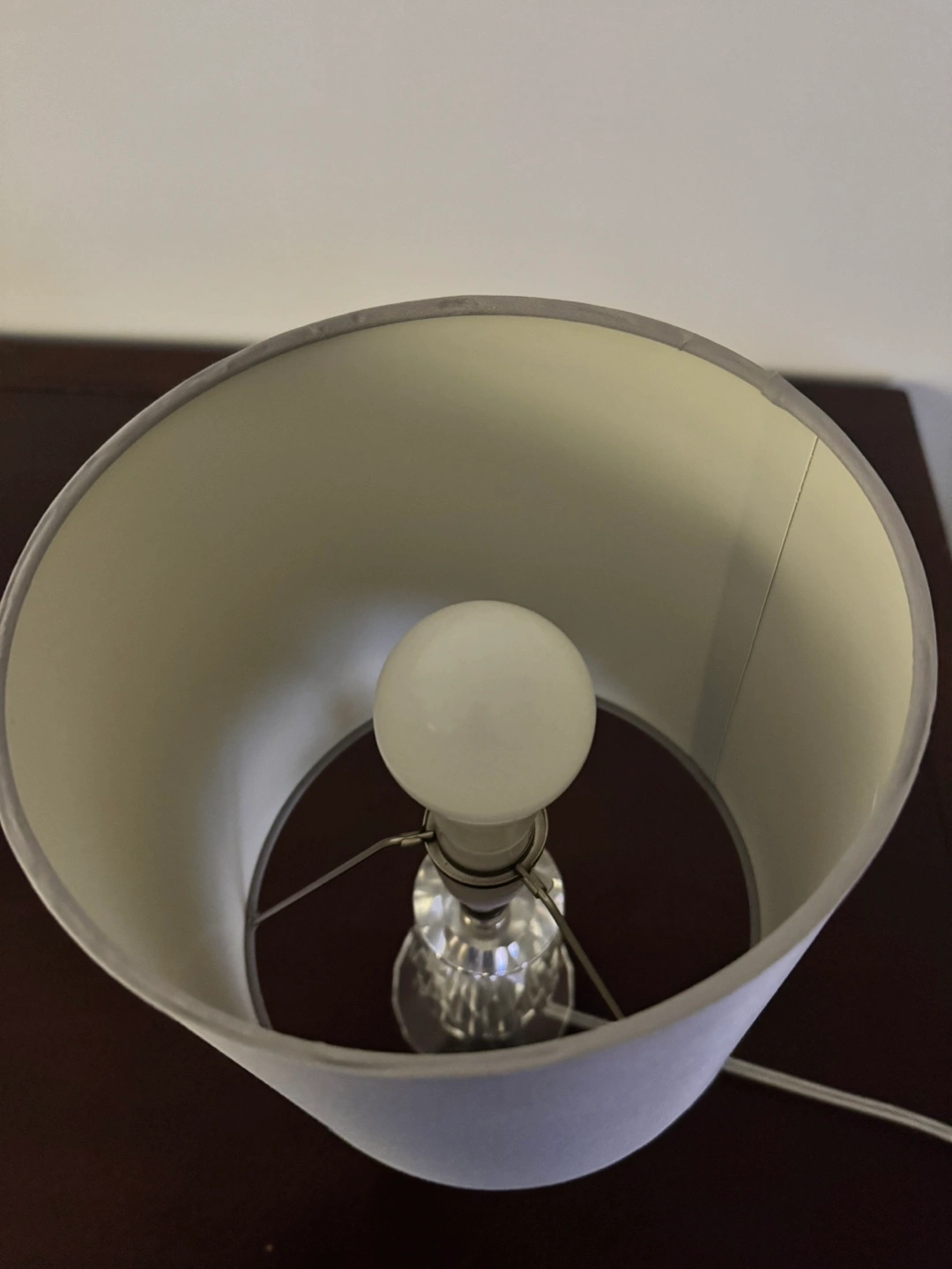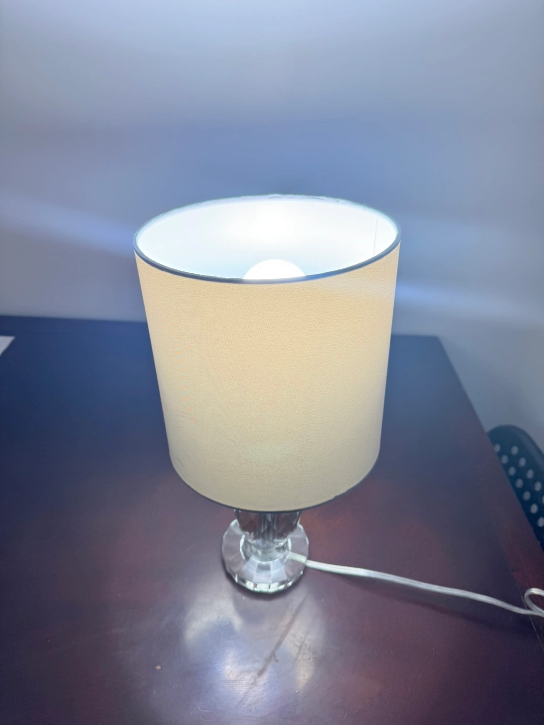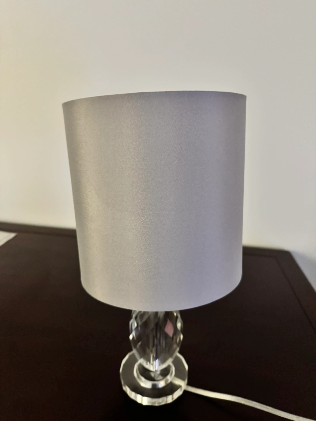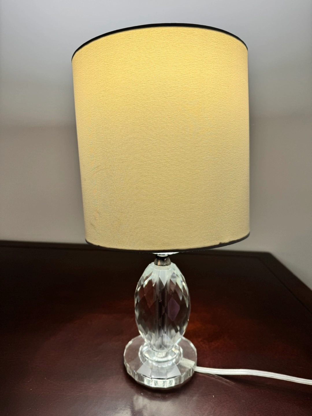 Crystal table lamp with a fabric shade. The lamp base is made of clear crystal and has a round, flat base. The shade is a neutral colour and is in excellent condition.
