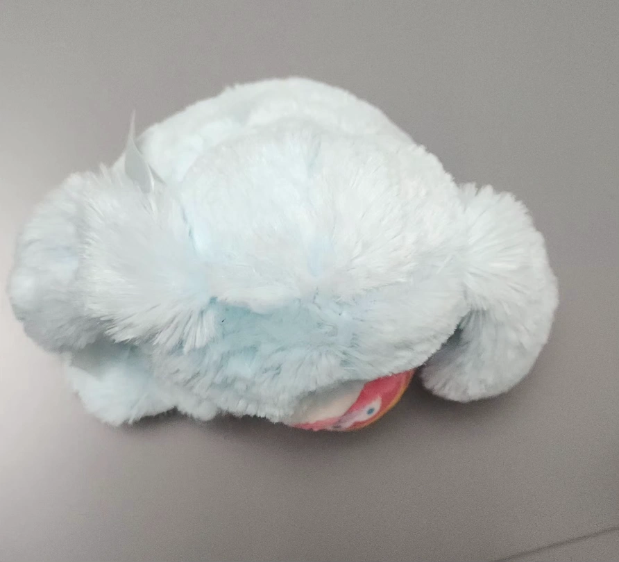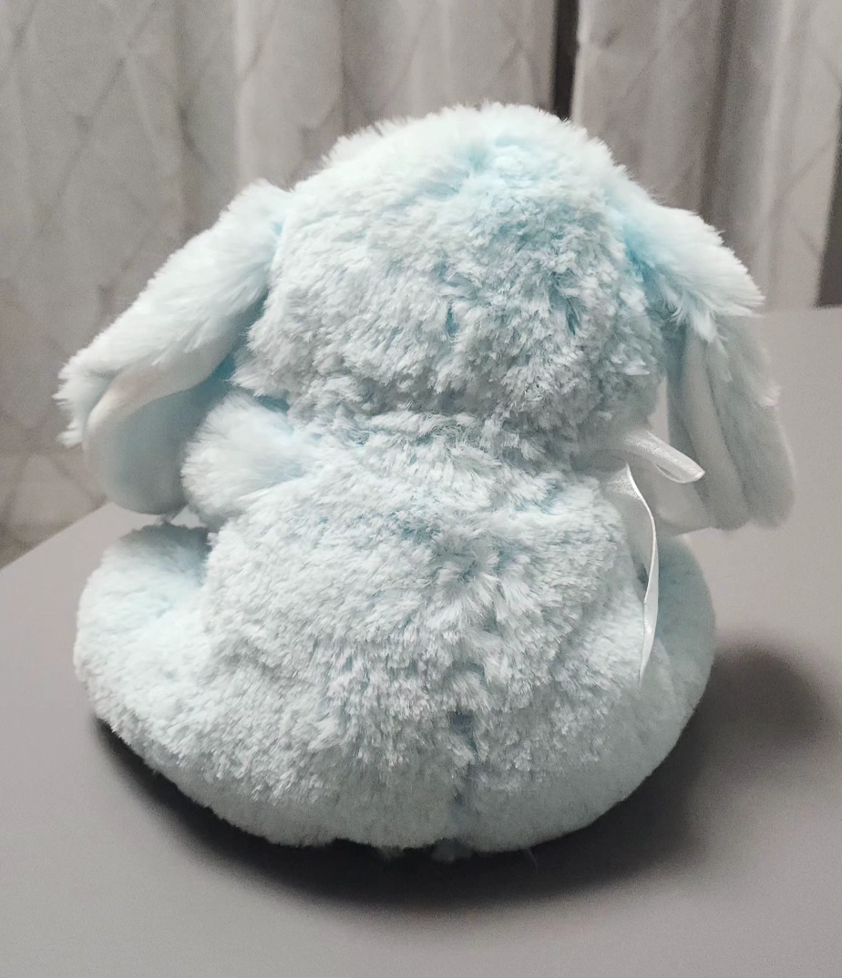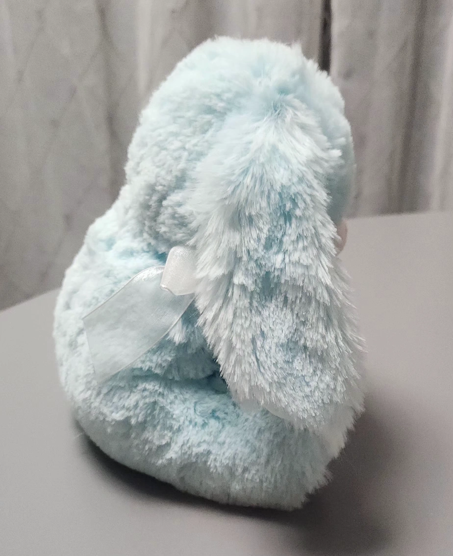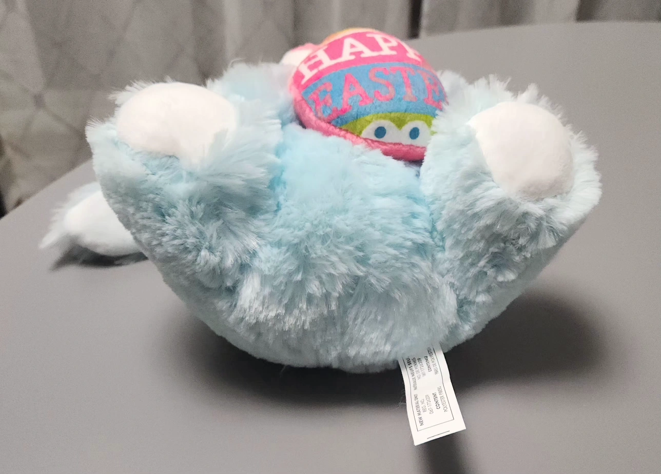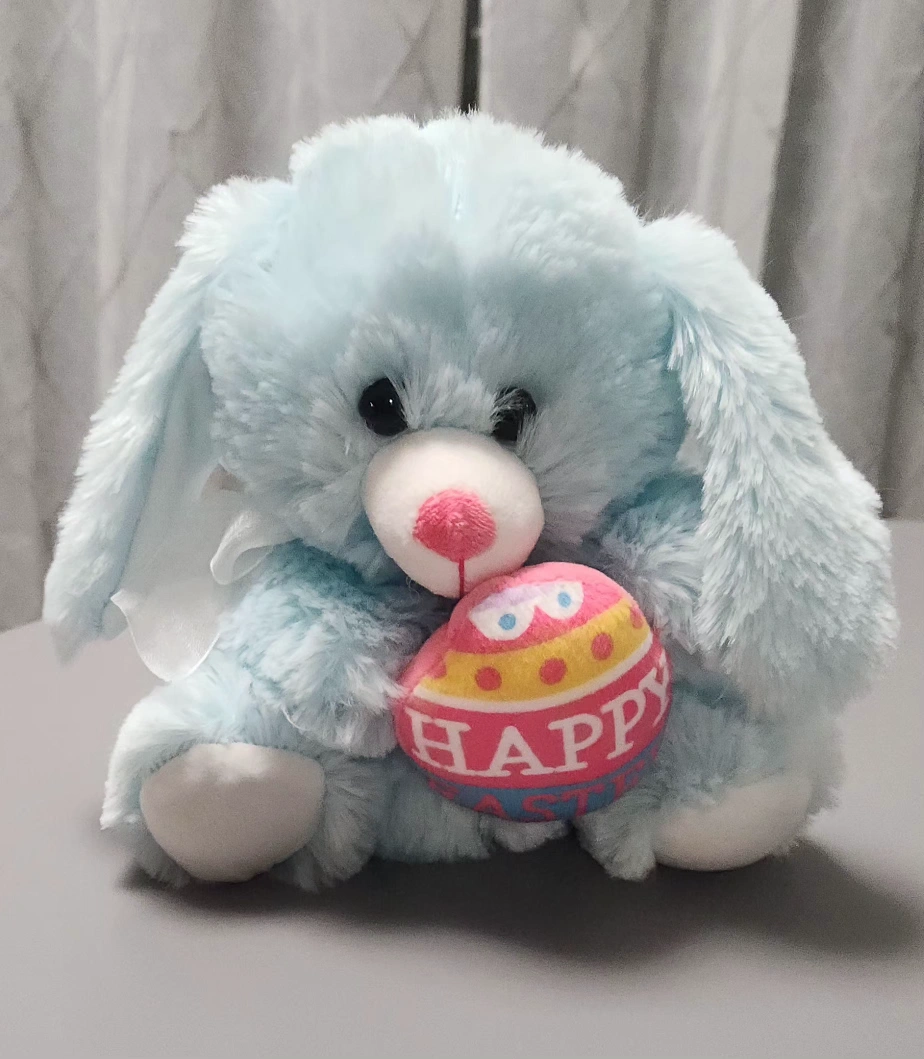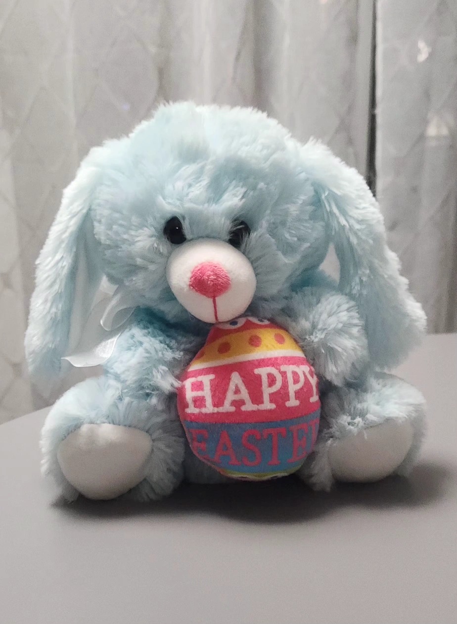 Blue stuffed fluffy bunny holding a colorful egg that says "Happy Easter". White bow tied around the bunny's neck. Like new condition. Measures approximately 7" high, 7.5" wide and 5" deep.