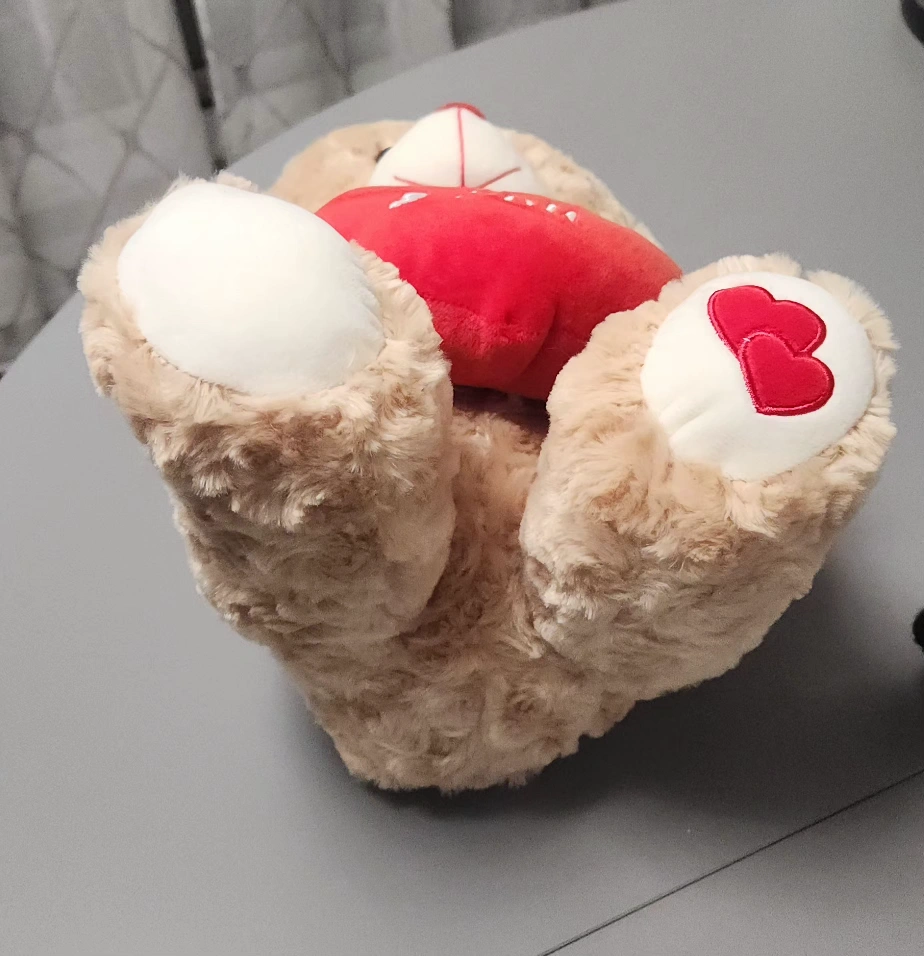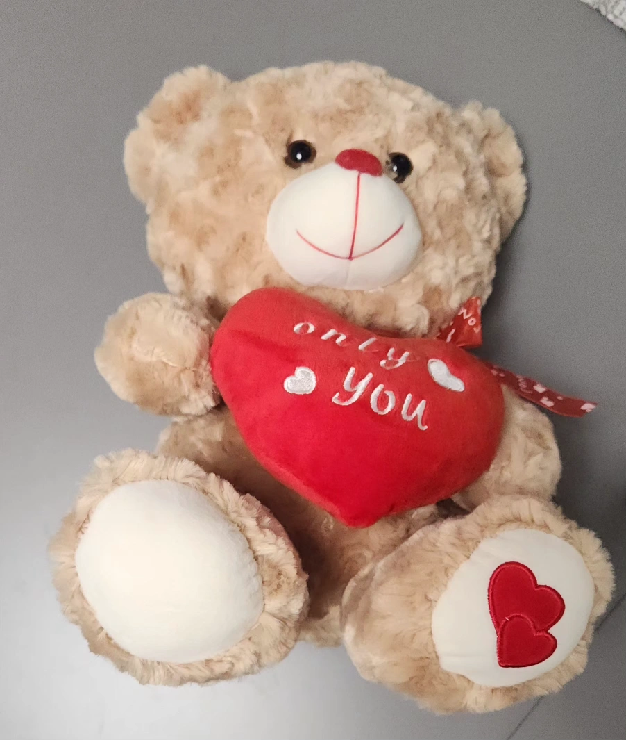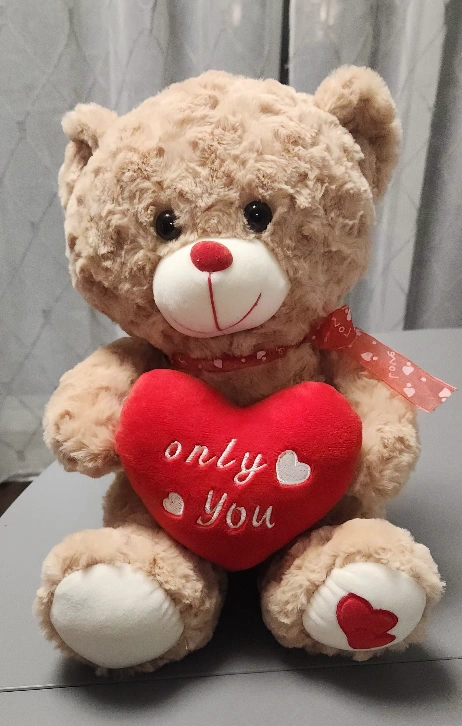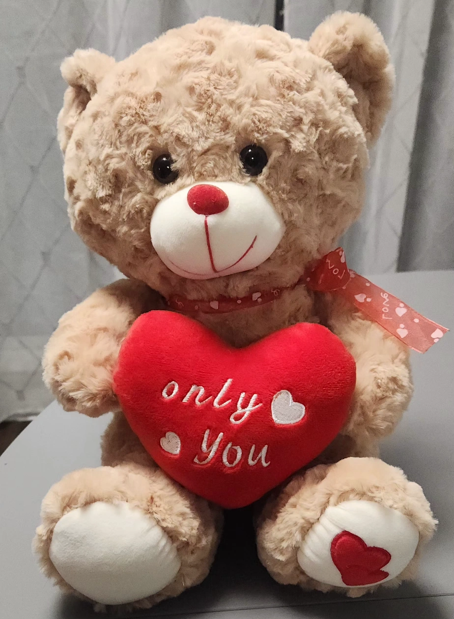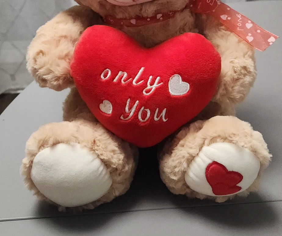 Valentine's stuffed bear holding a heart saying "Only You" with a heart on one foot. Red ribbon with white hearts and the word "love" on a ribbon around the bear's neck. Like new condition. Measures approximately 12" tall, 8" deep and 9" wide.