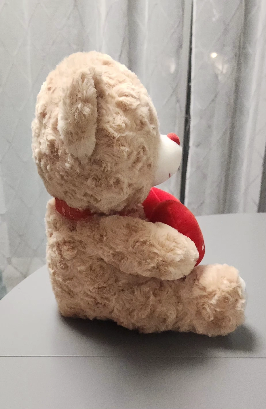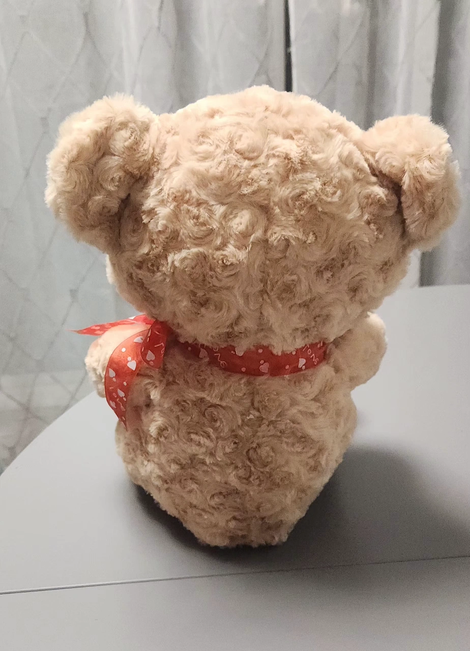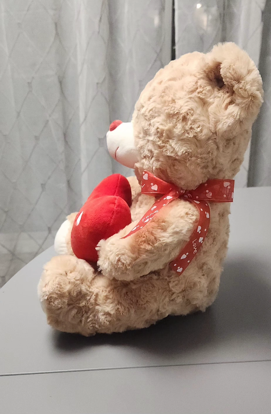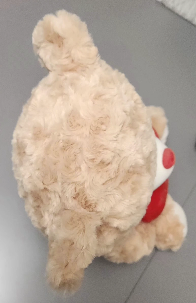 Valentine's stuffed bear holding a heart saying "Only You" with a heart on one foot. Red ribbon with white hearts and the word "love" on a ribbon around the bear's neck. Like new condition. Measures approximately 12" tall, 8" deep and 9" wide.