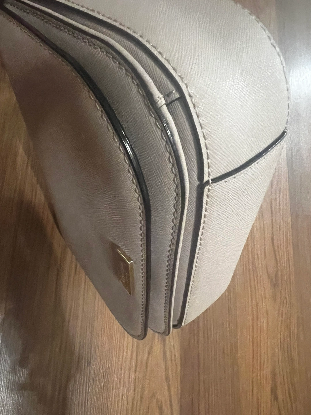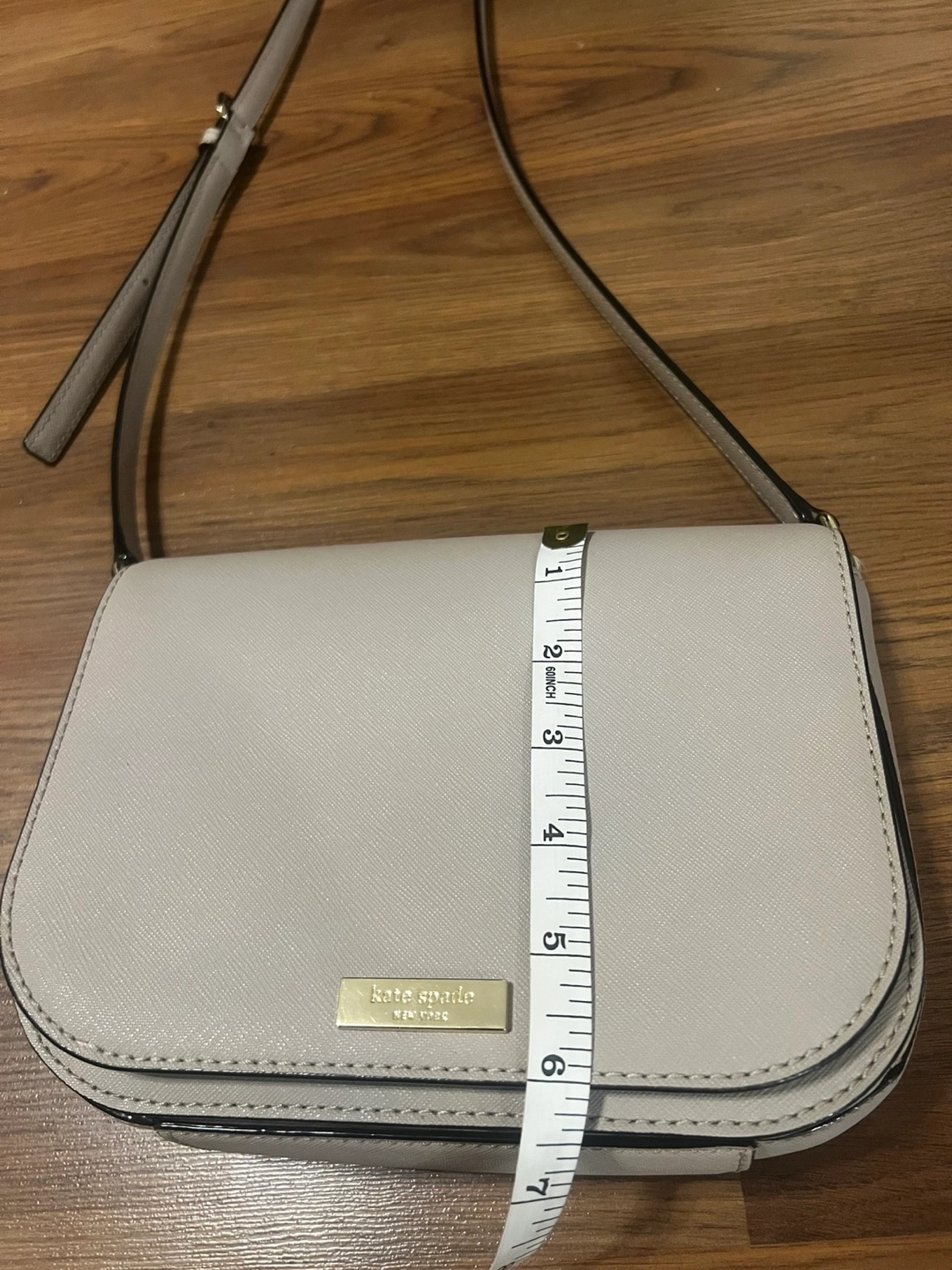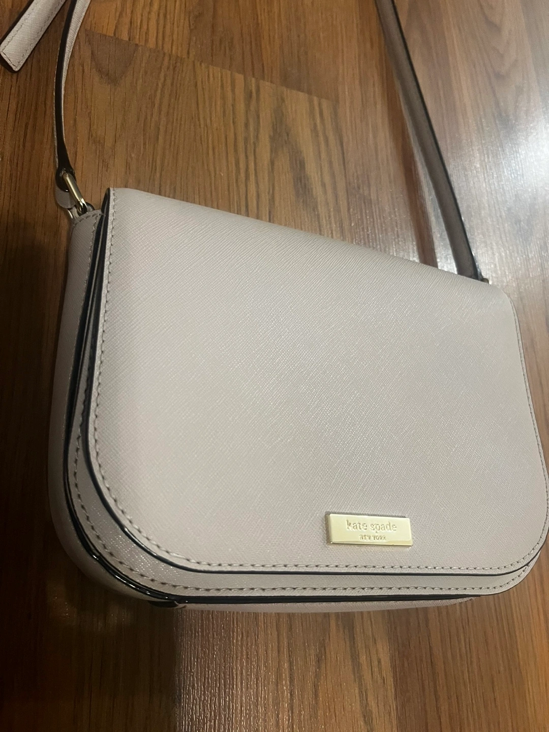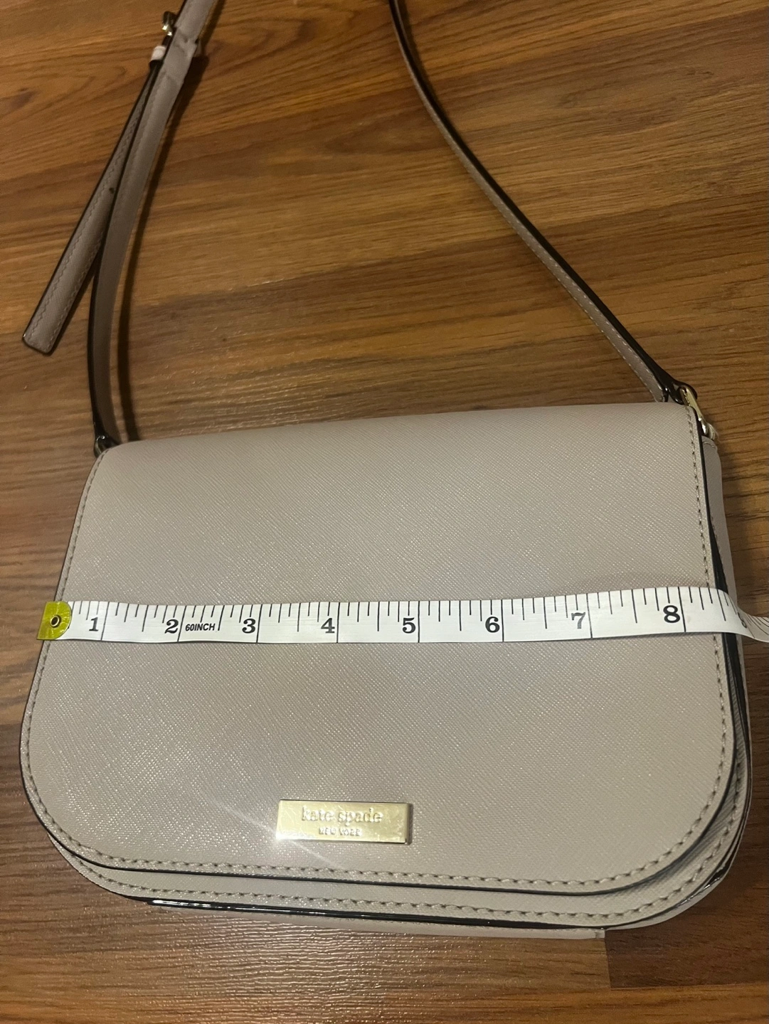 This cross body purse is in excellent condition. Exterior 9/10 Interior pristine, no stains, no flaws, no marks. Condition 10/10 Material: Saffiano Leather Colour: Very light pinkish/beige Measurements: please refer to photos. - Clasp closure - Inside pocket - Flap front - Adjustable Leather Strap: 20.5’ - 22.5’ Please see other items. All are negotiable for serious buyers.