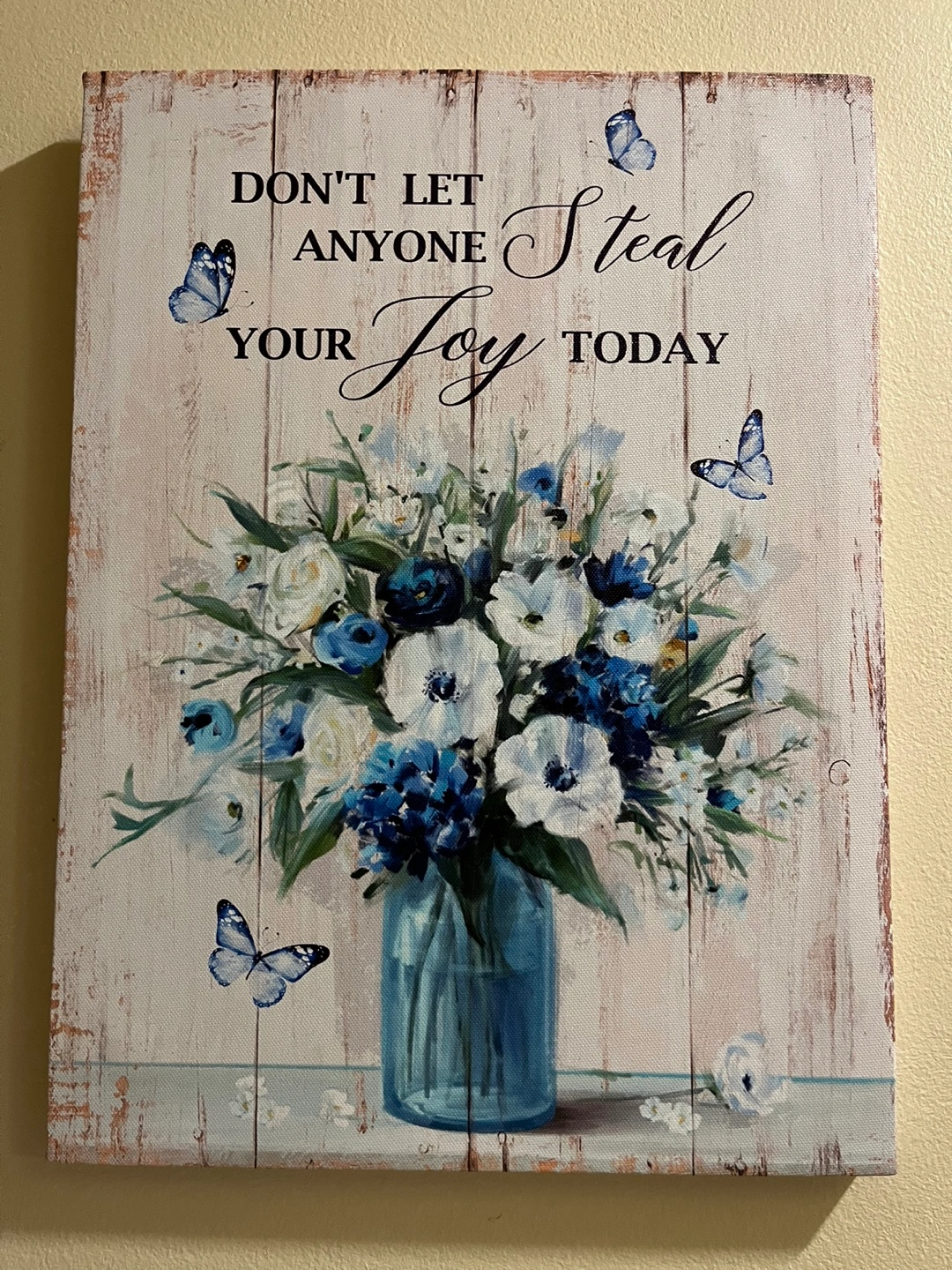Canvas wall art with a floral design and the message 'Don't let anyone steal your joy today'. The image is framed on a wooden canvas.