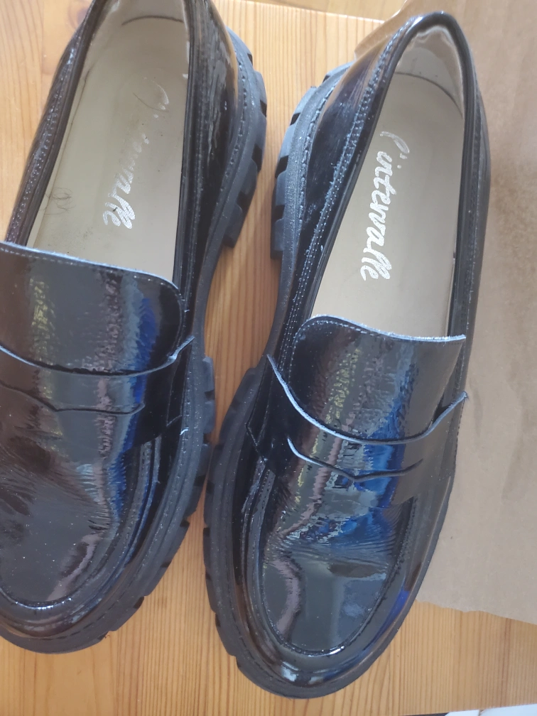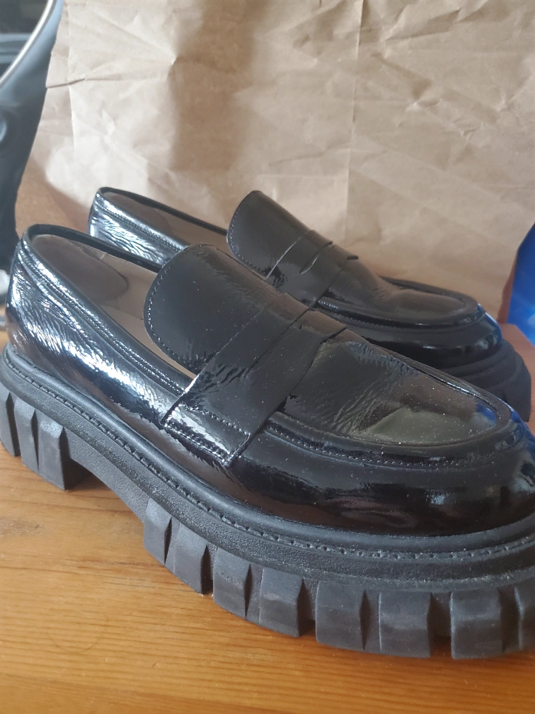 Black patent leather loafers with a chunky platform sole. They are in good condition. made with REAL leather upper and lining in Europe selling because they are 1 size too small for me