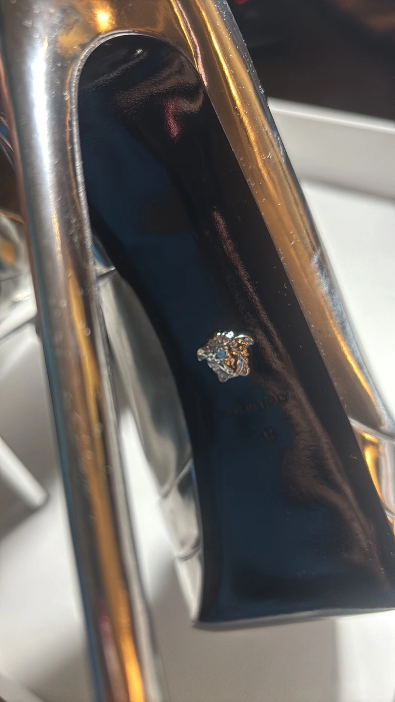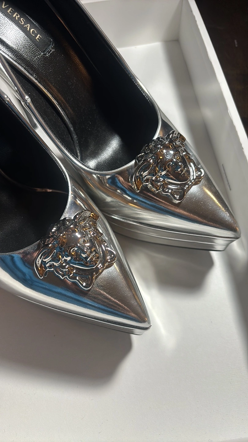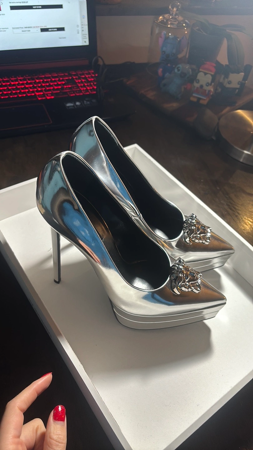 Silver high heels with Medusa head detail. Platform and stiletto heel.