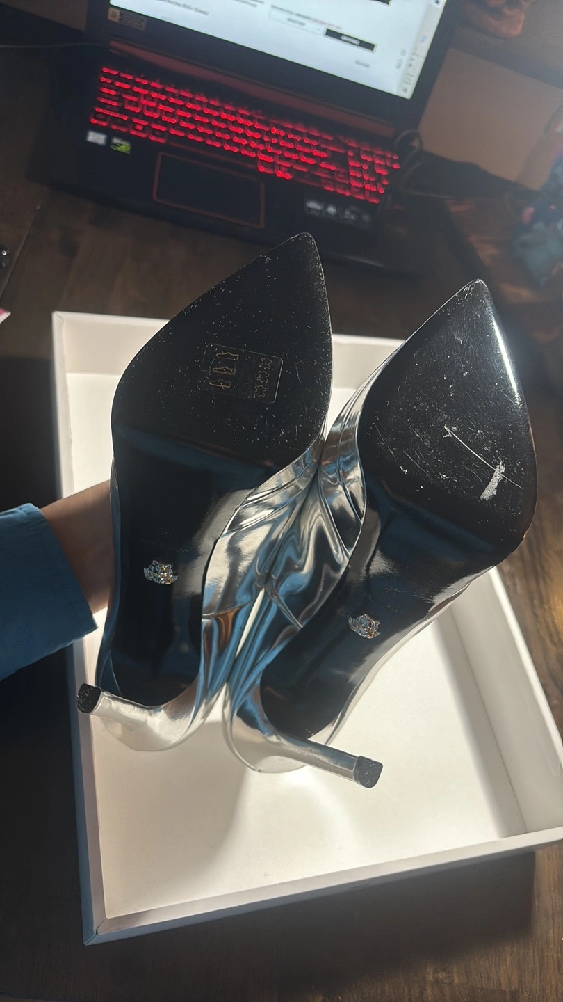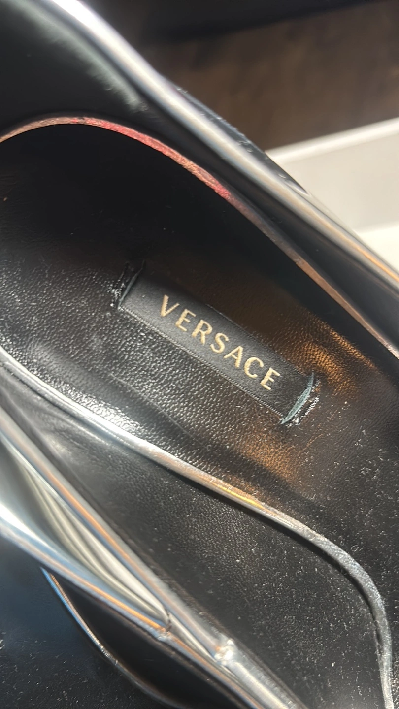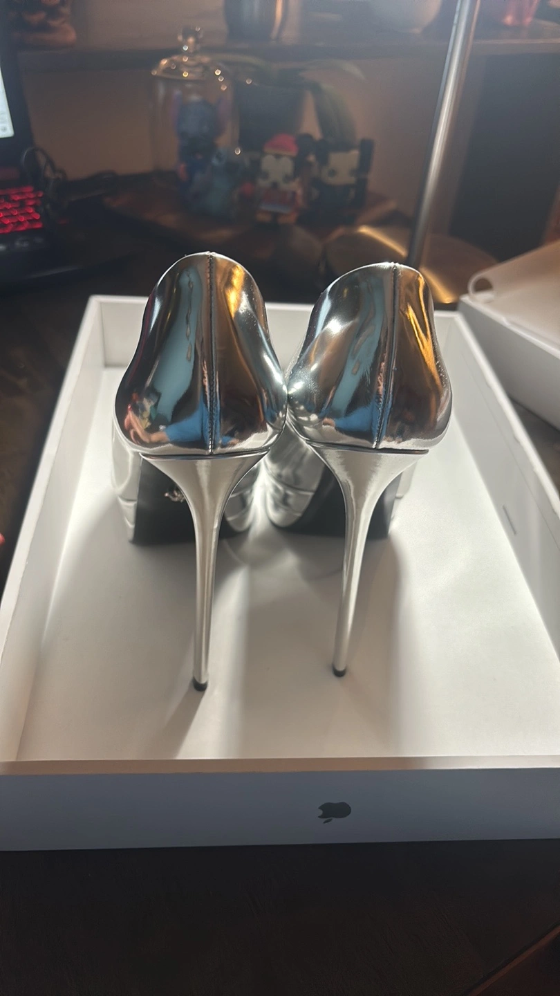 Silver high heels with Medusa head detail. Platform and stiletto heel.