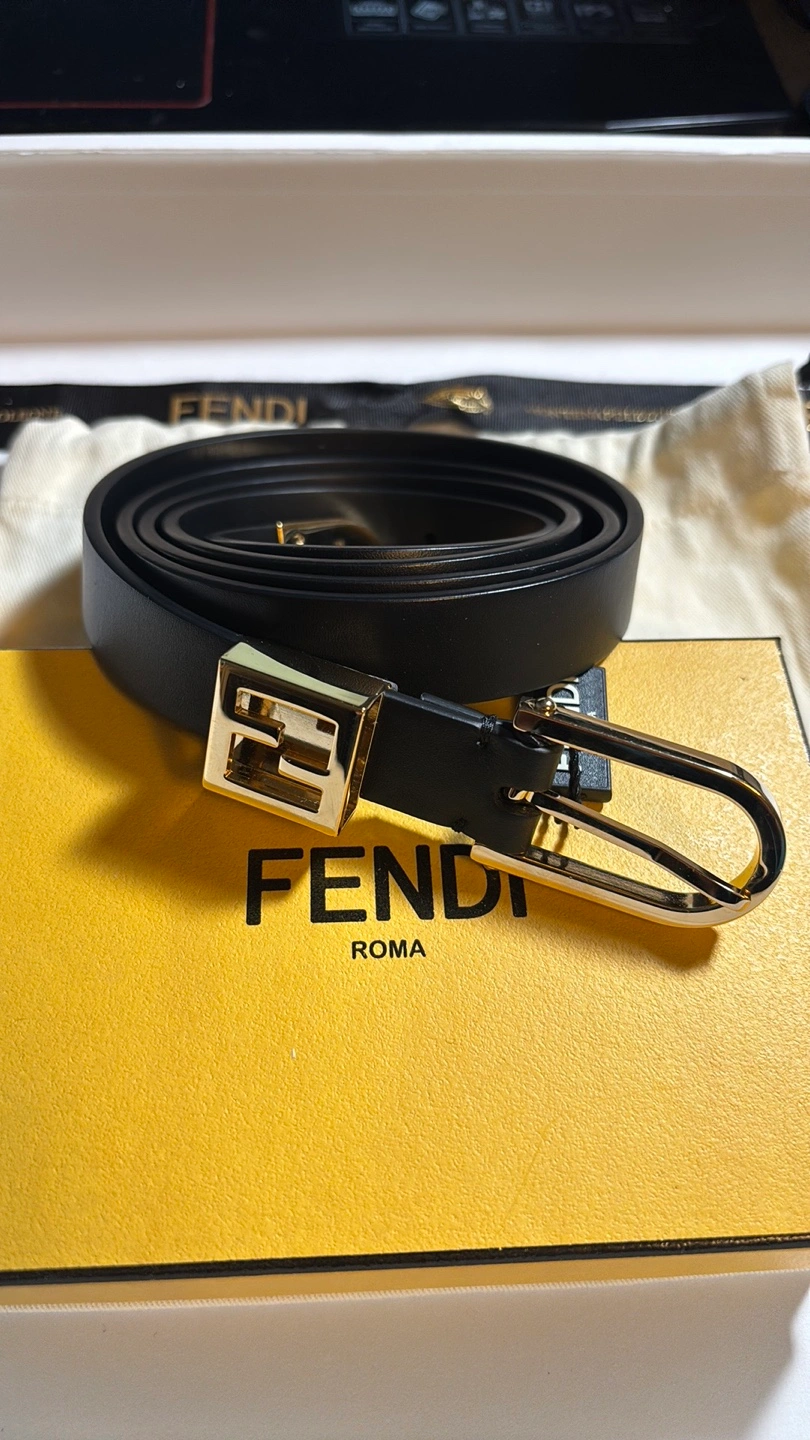 Black leather belt with gold hardware. Comes with box and dust bag.