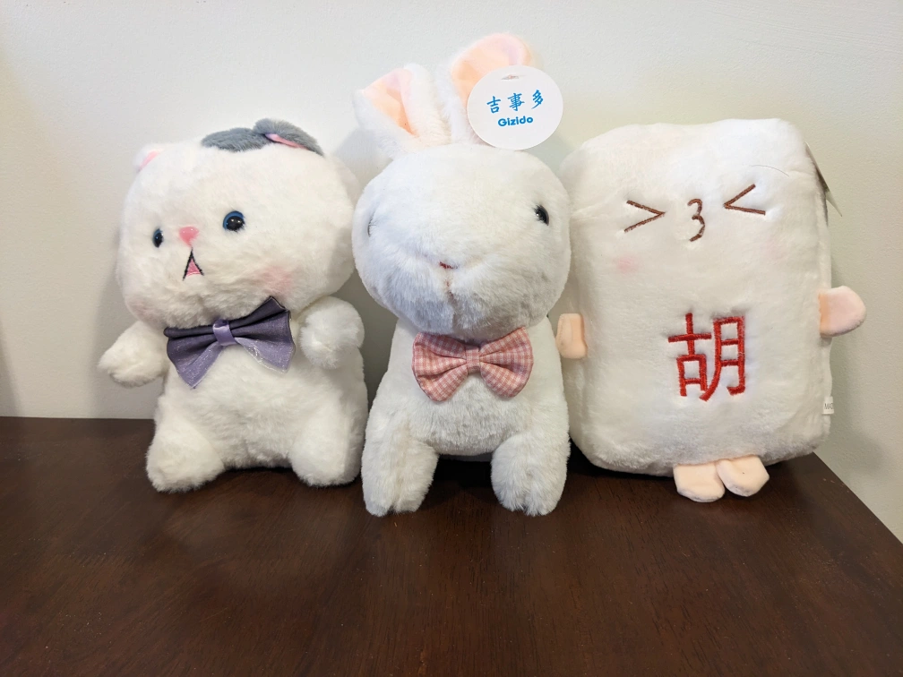 Set of 3 plush toys. White cat, white bunny, and mahjong tile. About 20cm tall. 2 dollars each or 5 for the set