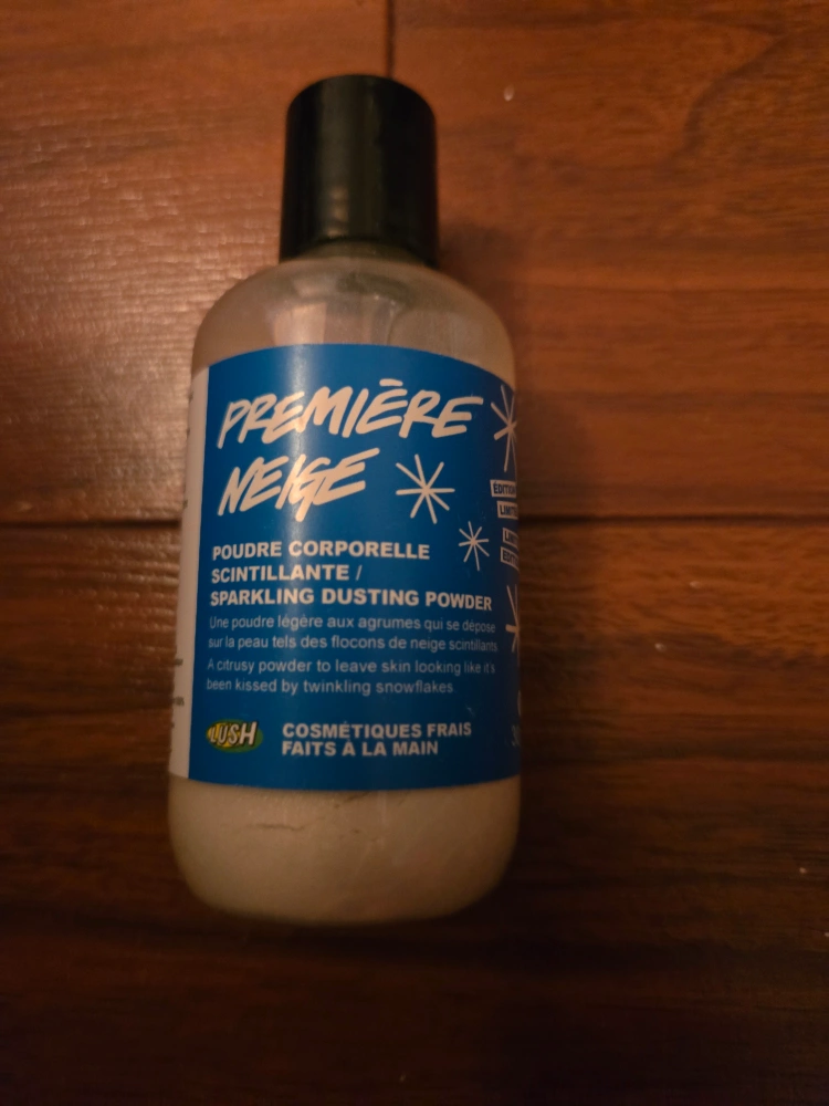 Limited edition body powder. Citrusy scent. Leaves skin looking like it's been kissed by twinkling snowflakes. Was tried by a friend but still more than half way full.