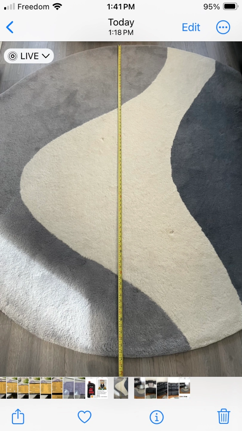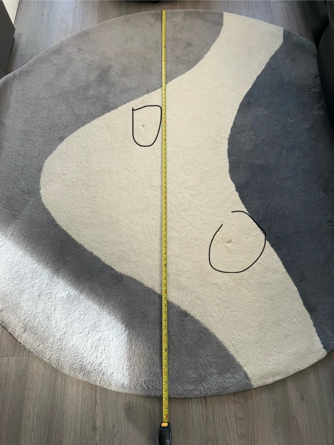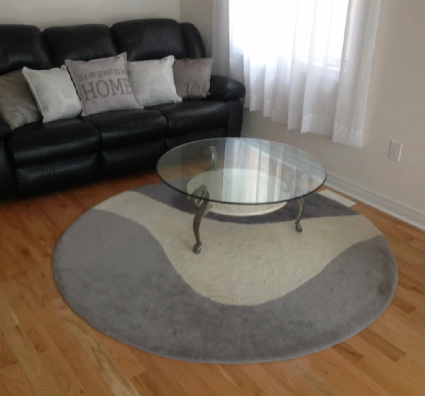 Quality Large round area rug with grey and white colours and a wavy pattern. Approximately 198 cm / 78โ in diameter. Some minor damage by the coffee table legs .(see picture 3) Original value $500+ Now asking $65 for the carpet only *PLEASE CHECK OTHER LISTING BY ERIC *QUALITY AND BARGAIN ITEMS MIGHT INTERESTED YOU Thank you ๐ค