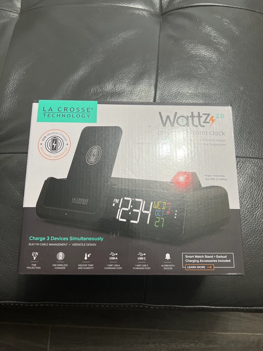 Project time onto your wall or ceiling. Includes wireless charger, USB-A and USB-C charging ports, and an alarm with snooze. Also includes a smart watch stand and earbud charging accessories.
