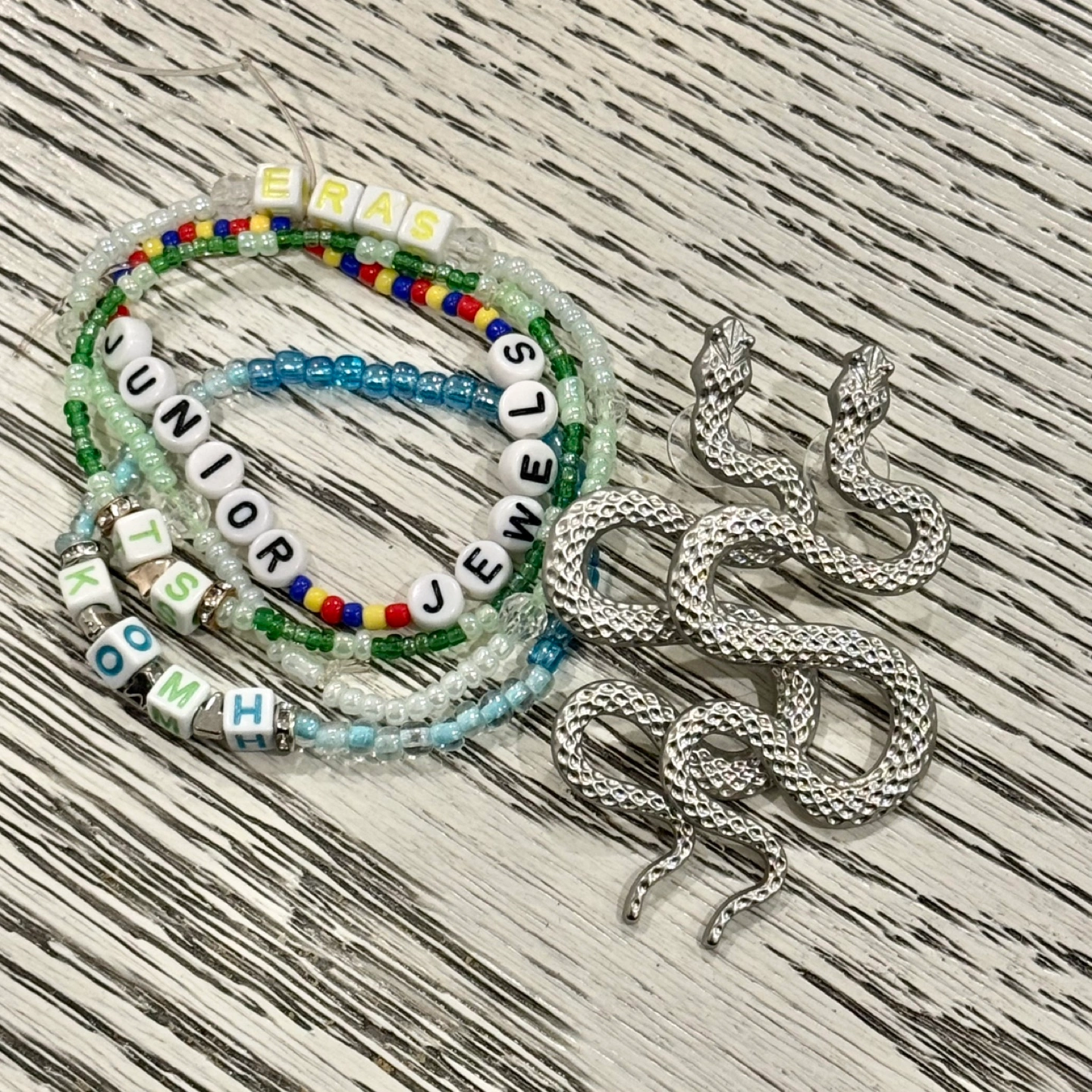 New, never worn silver snake earrings. Inspired by Taylor Swift’s reputation album! Comes with 4 handmade friendship bracelets, as pictured. Perfect gift for a swiftie. Price is firm, cash only please. Pickup downtown Toronto/Jarvis & Gerrard/Yonge & Dundas or we can arrange to meet along TTC line 1.