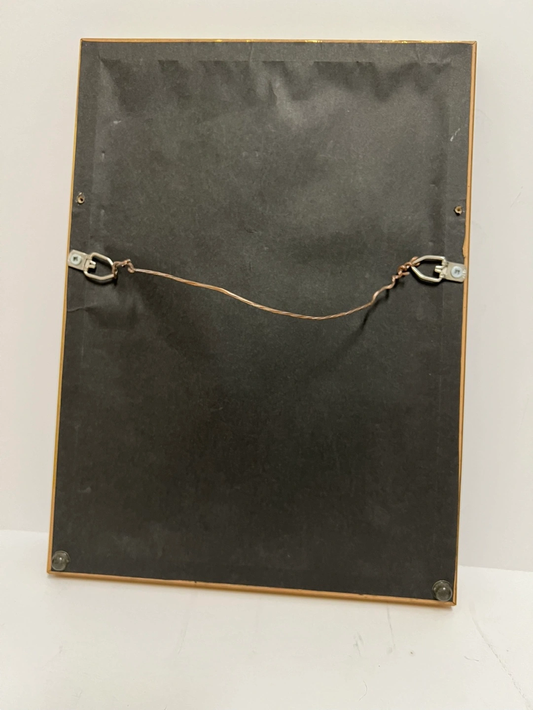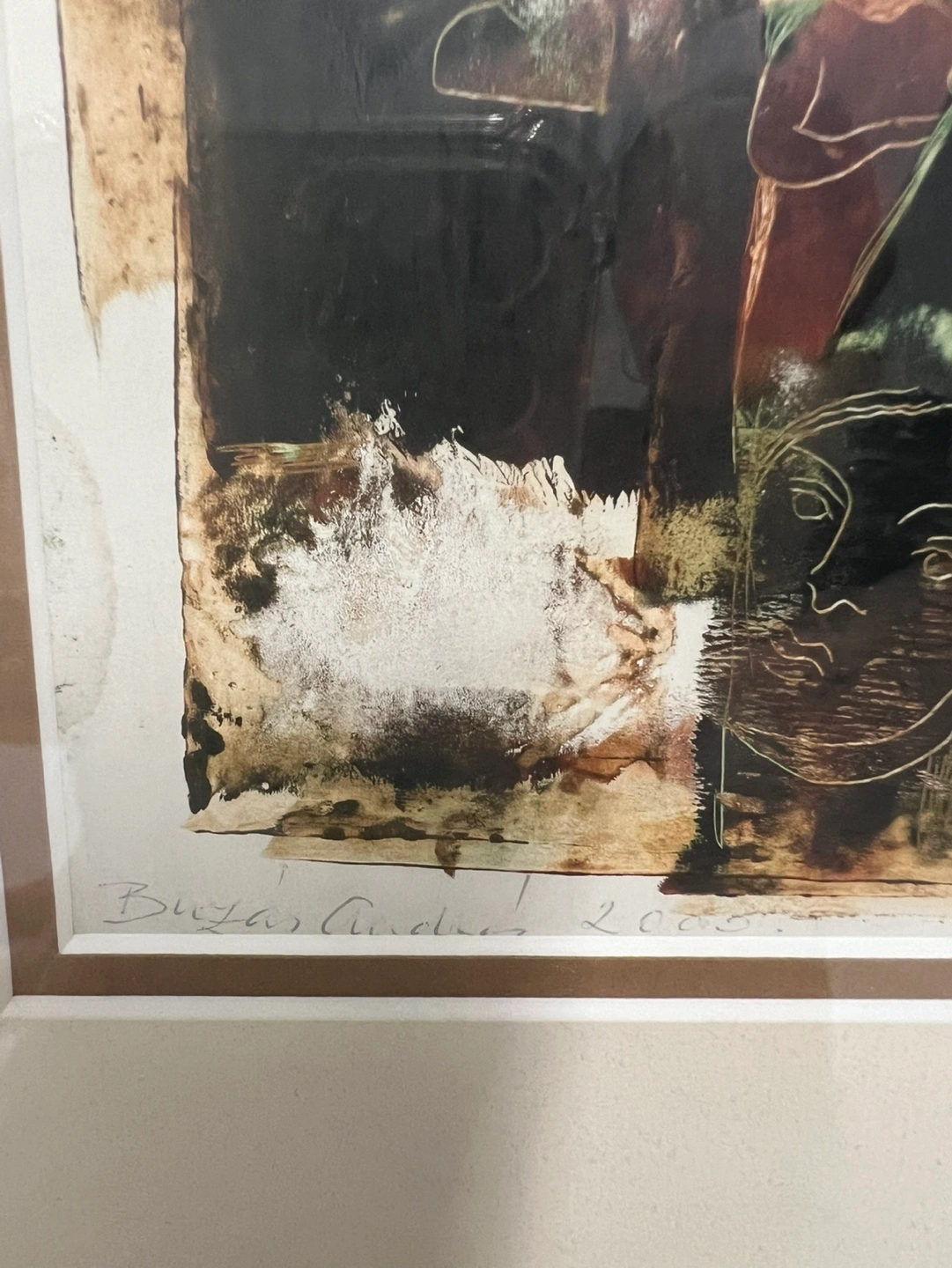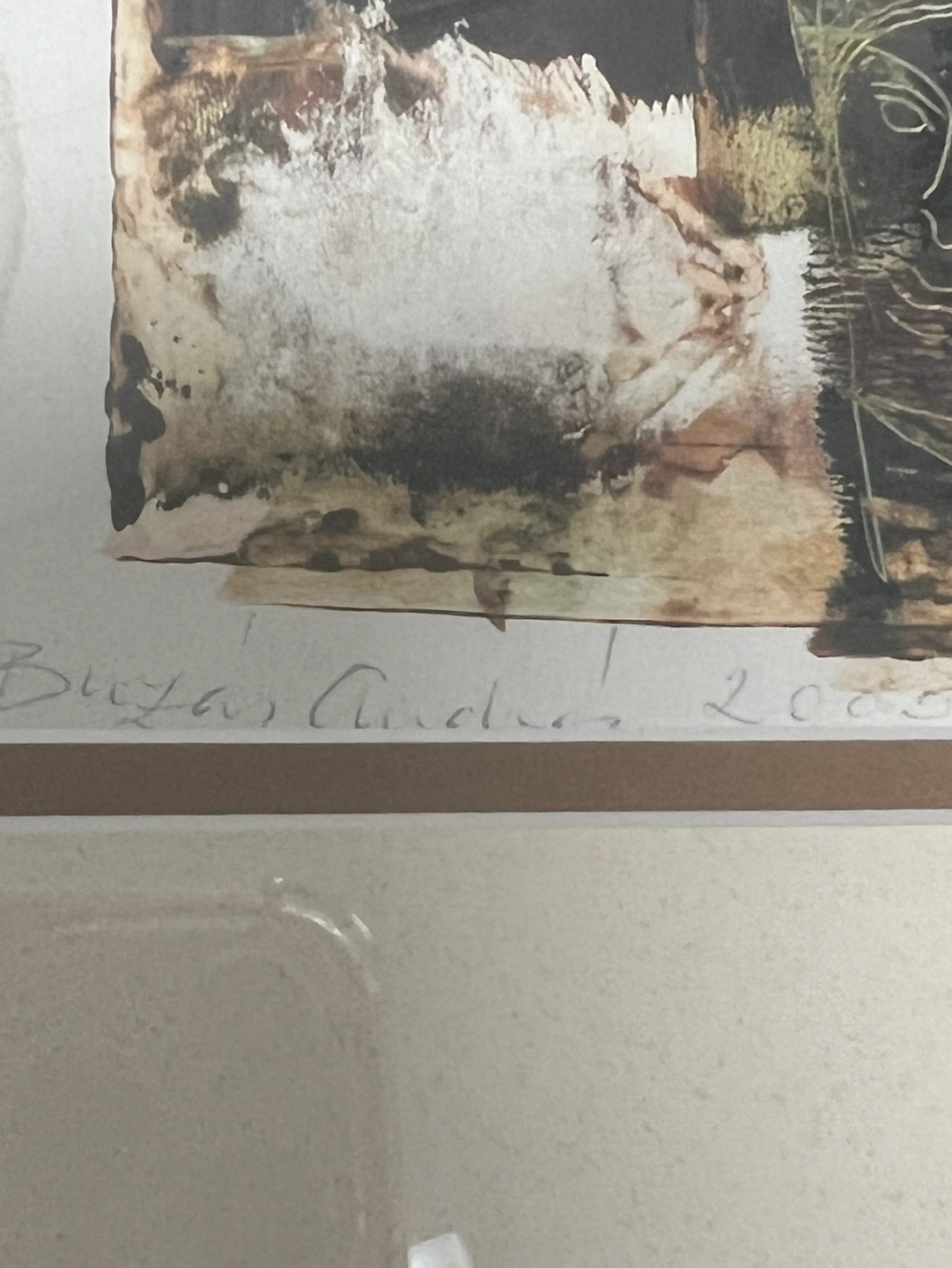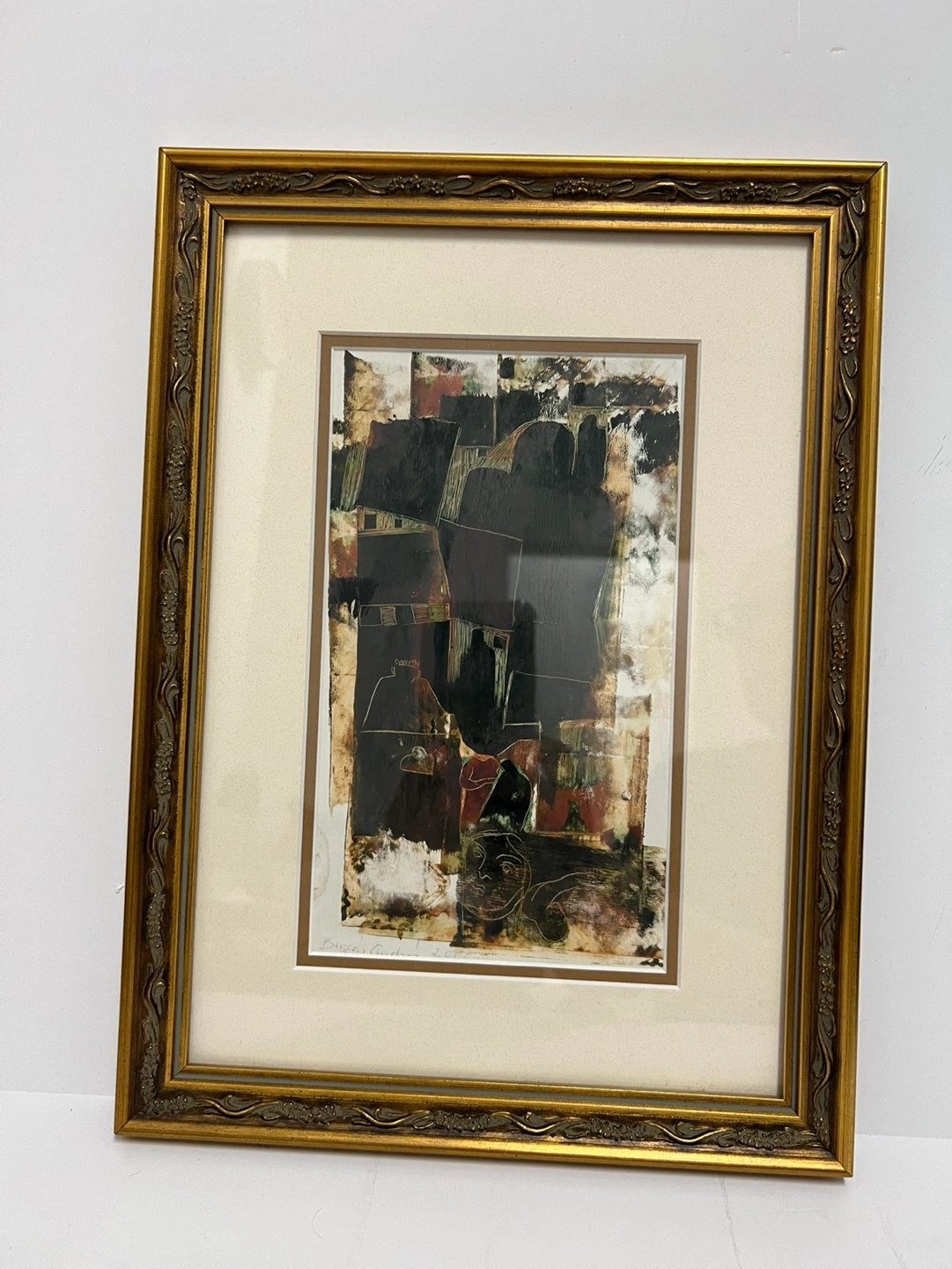 Framed abstract art print. Signed by the artist. The print features a collage of geometric shapes and figures, with a focus on a central figure. The colours are predominantly black, brown, and white. It is in good condition and comes with a simple gold frame. 9 x 13 inches Cash Pick up near Lawrence and Keele