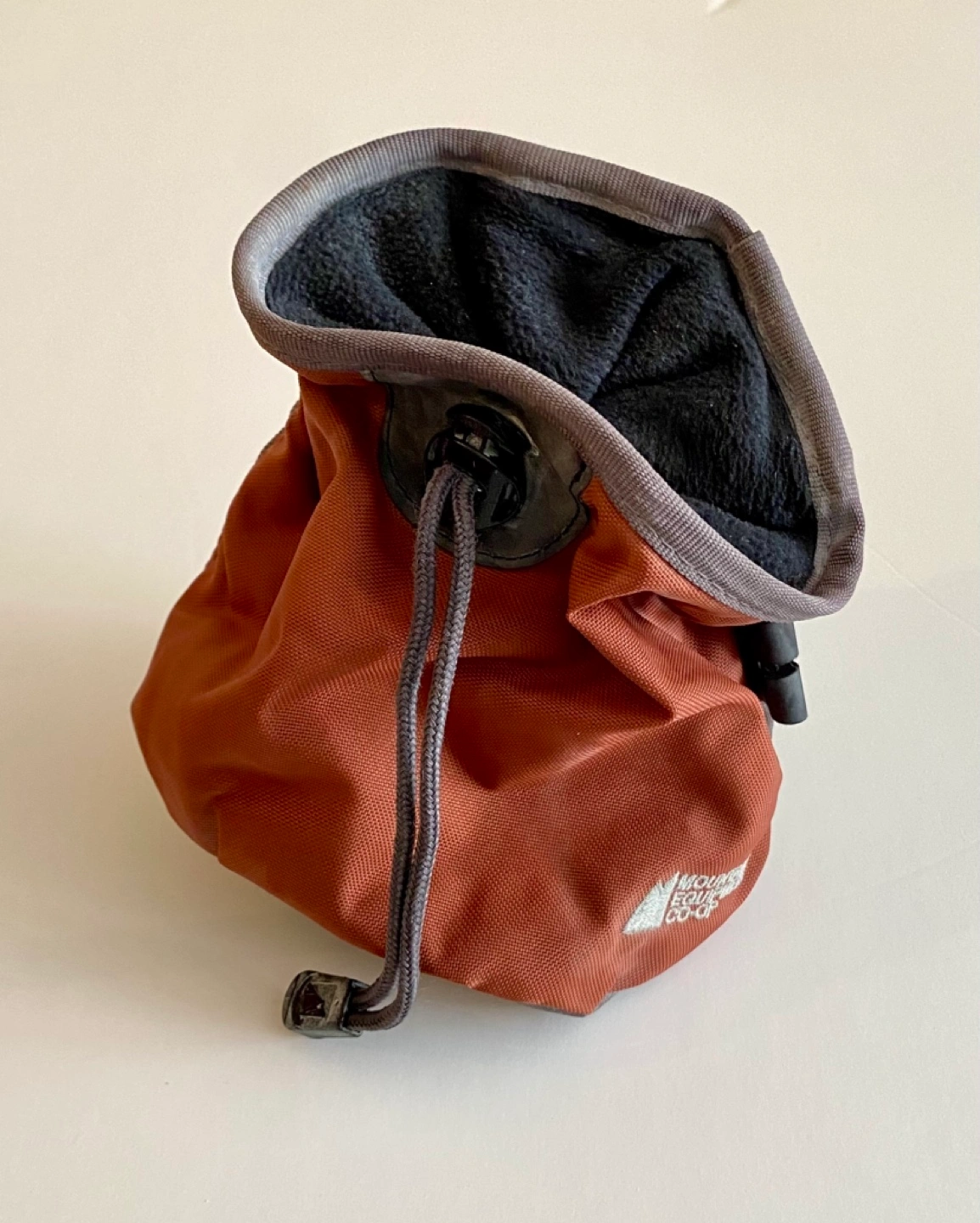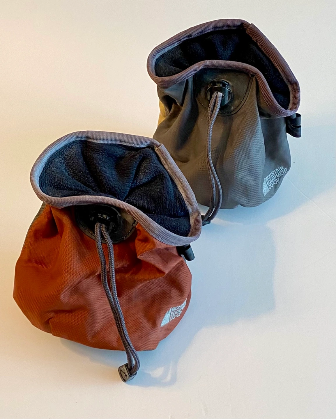 Pair of Mountain Equipment Co-op chalk bags. One grey and one orange.