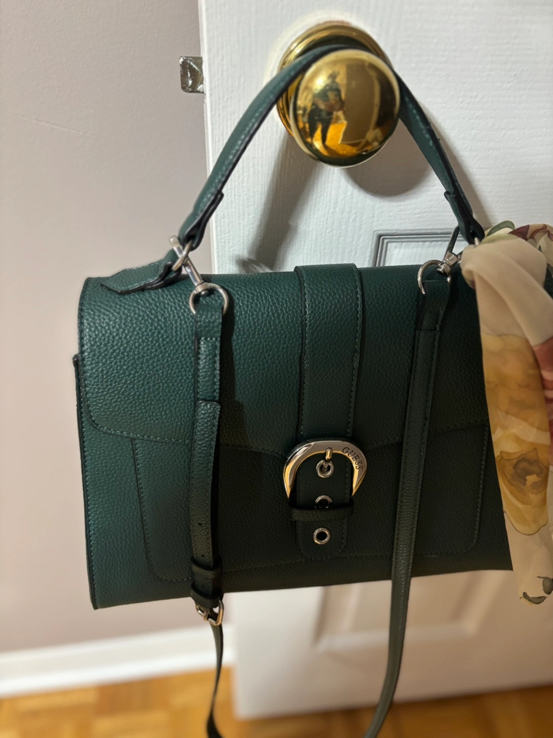 Green satchel bag with a silver buckle and a long shoulder strap. Has a top handle and a zipper closure.
