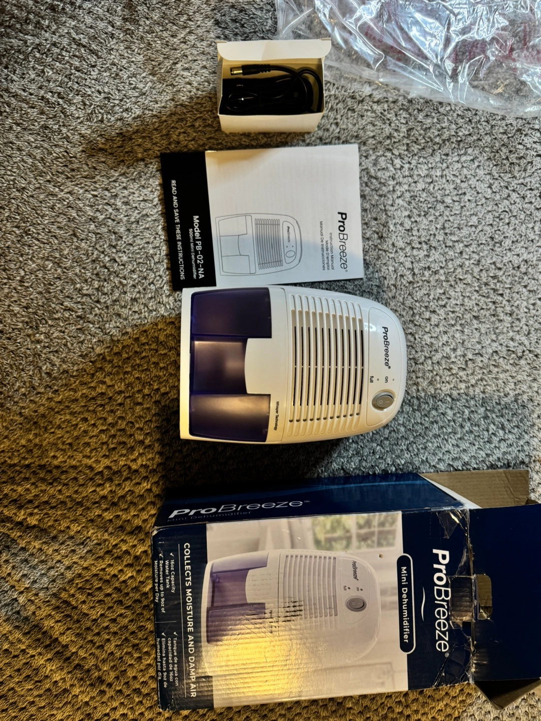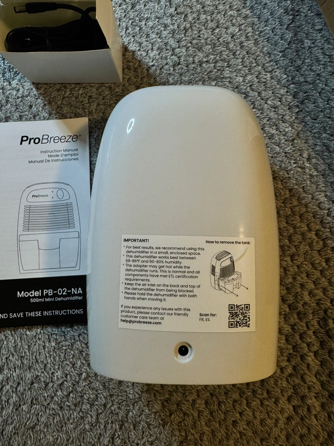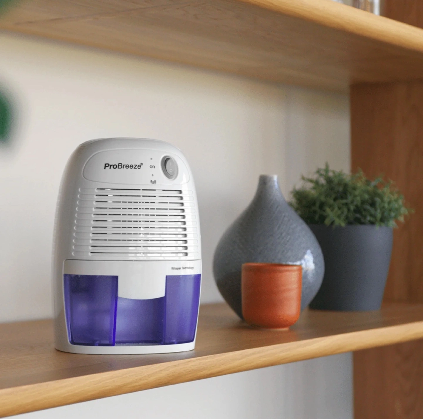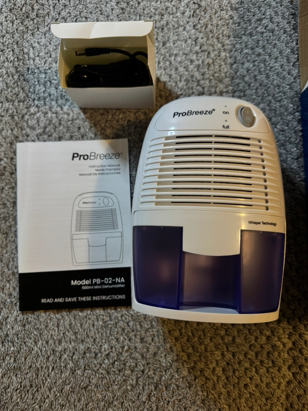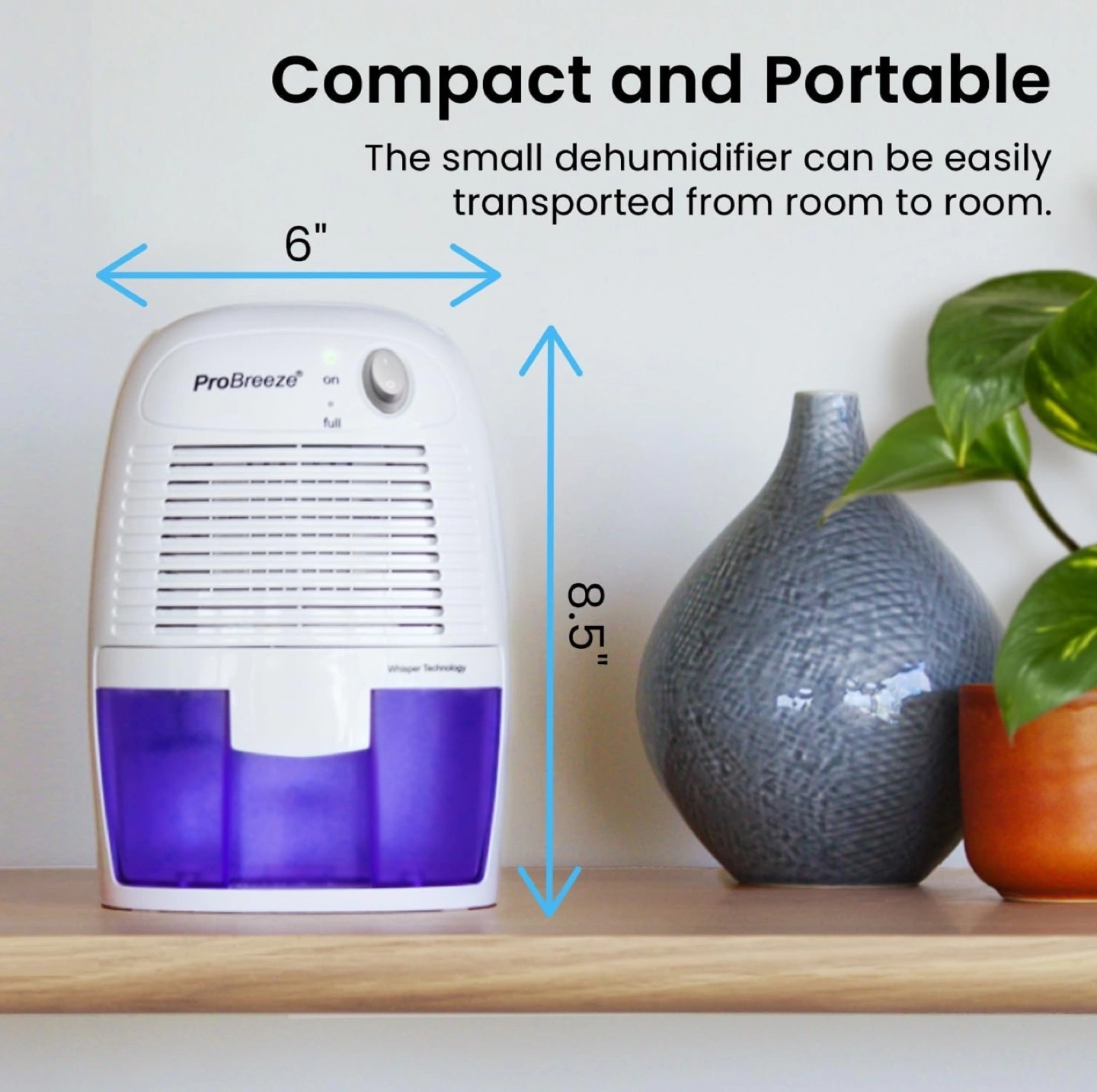 Small dehumidifier, portable and easy to move around. Comes with a power cord and instruction manual. SMALL & COMPACT: Only effectively works ABOVE 15°C. Lightweight, Compact and Portable – Capable of removing up to 9 ounces of water per day with a 16-ounce water tank capacity. Ideal for rooms up to 1200 cubic feet (150 sq ft). AUTO SHUT OFF: When full the dehumidifier will automatically shut off and the LED light will turn-on indicating the water tank needs draining. Simply empty the water tank and place it back into the dehumidifier. ULTRA-QUIET & EFFICIENT: Built-in Thermo-Electric Cooling Technology (Peltier) operates without a compressor meaning whisper quiet operation in bedrooms, bathrooms and offices. REMOVES 9 OUNCES OF MOISTURE/DAY: Optimal function in room sizes up to 1200 cubic feet (150 sq ft). LOWERS HUMIDITY: Perfect for high humidity in your home, kitchen, bathroom, bedroom, caravan, garage, closet. Like all mini dehumidifiers, optimal operating temperature is 59-86°F. It will not work below 41°F.