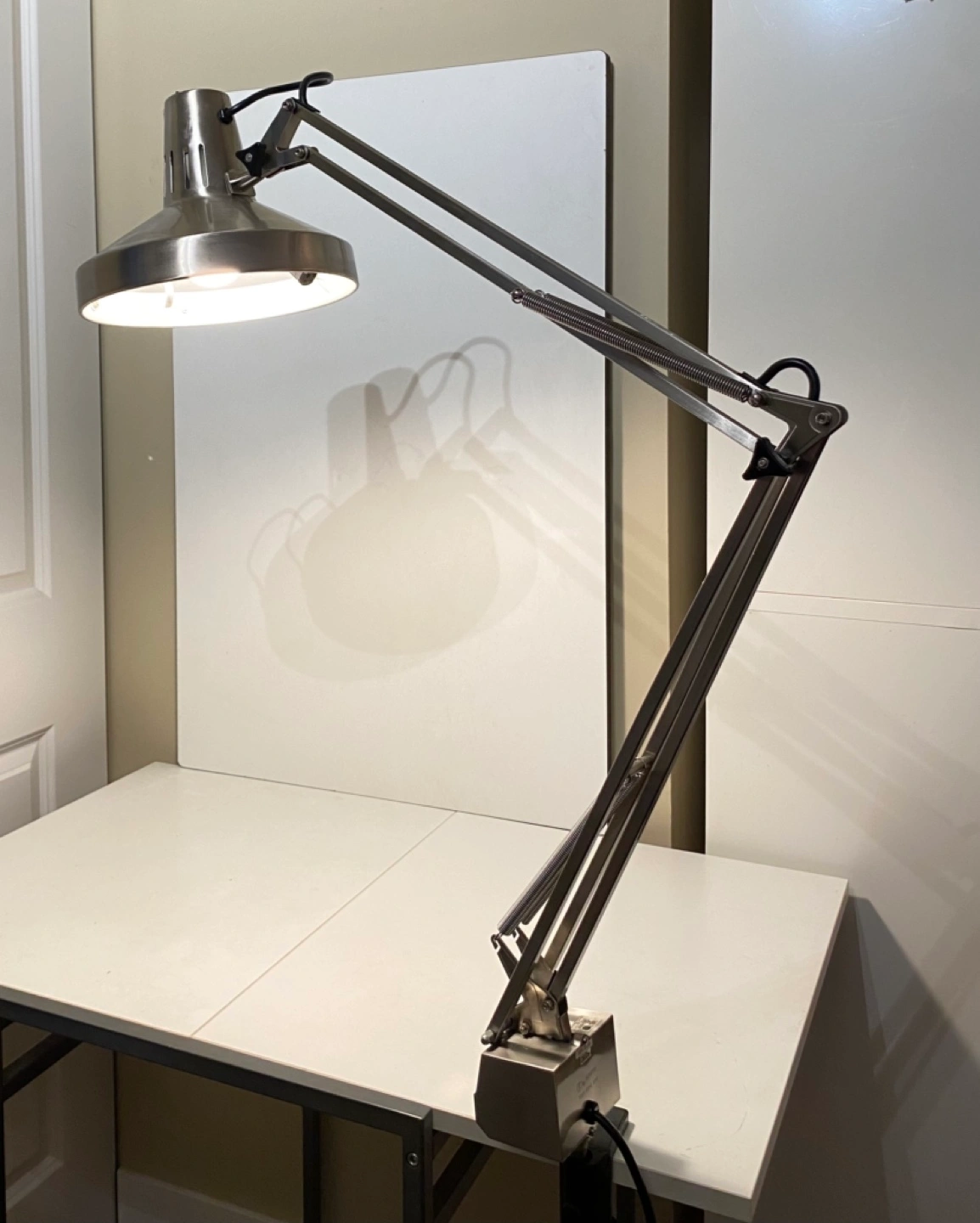 Silver desk lamp with adjustable arm. Has a clamp for attaching to a desk. Bulb included.