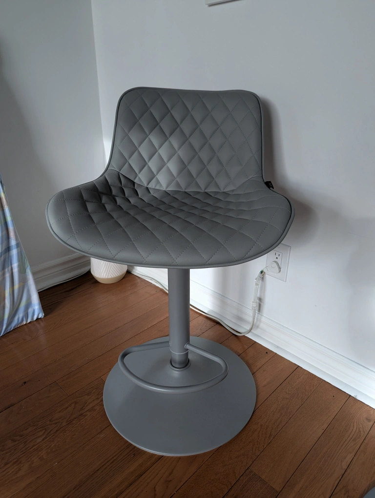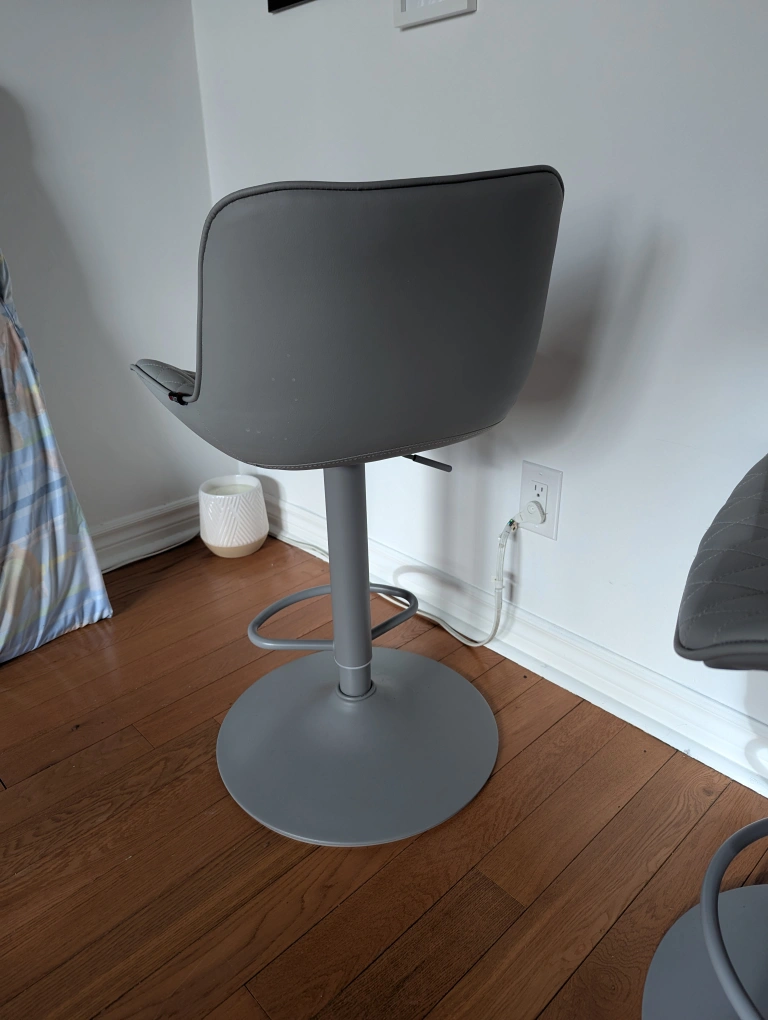 Grey upholstered bar stools. Set of 2. Swivel and adjustable height. Padded seats. purchased in 2022, a little wear and tear, barely used as we have kids and never got to sit in them best offers accepted, 90 for both obo
