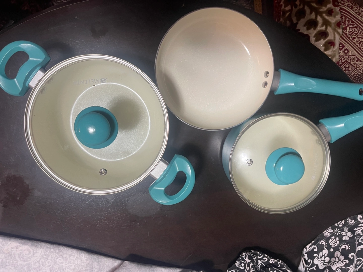 Set of 3 includes a small pot with lid, a larger pot with lid, and a frying pan. Blue handles, white interior. Brand new
