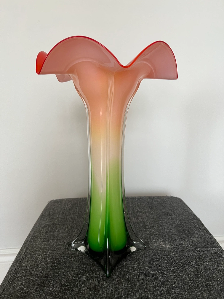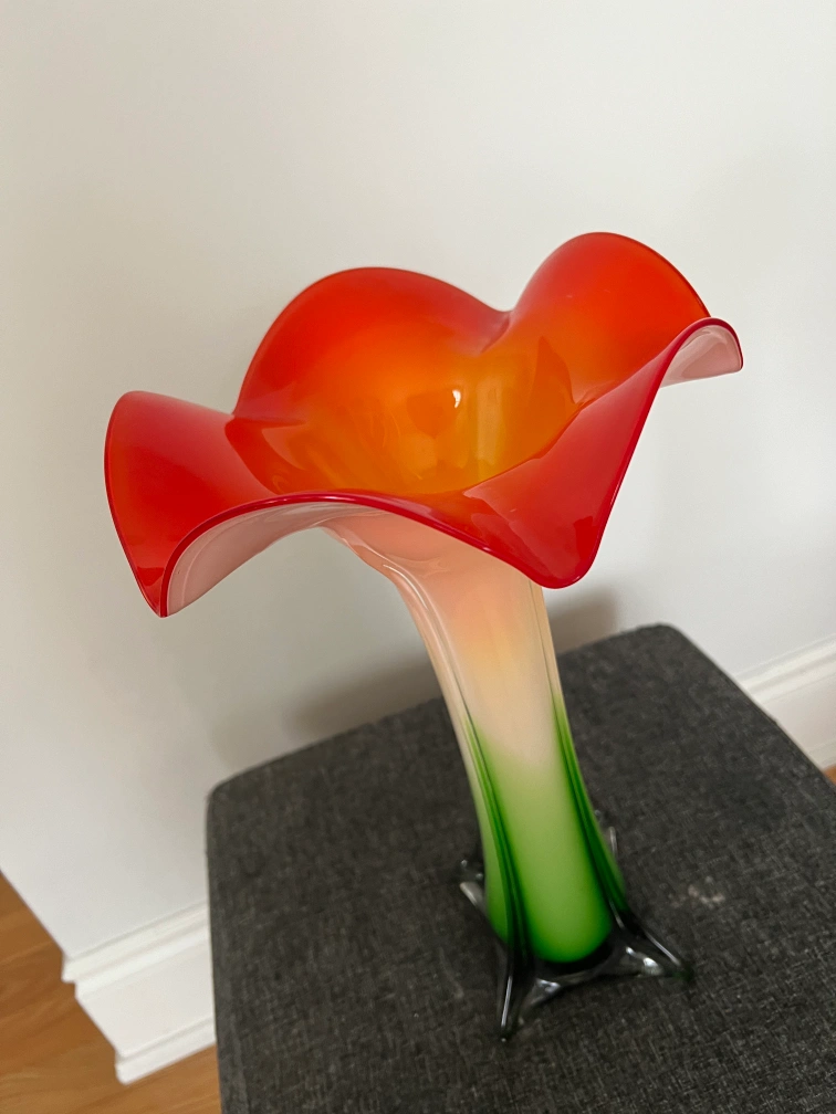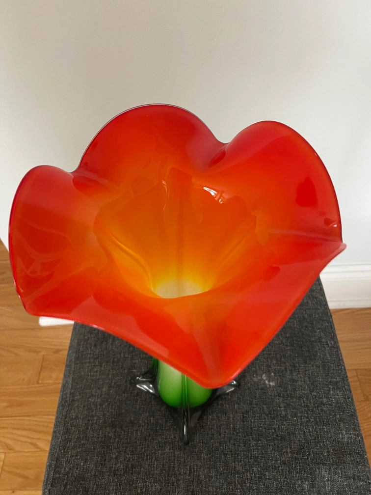 Tall glass vase shaped as a flower. It's a red, orange, yellow, white, and green color gradient with a wide flower shaped opening. Has a square base. Used a couple of times and has been cleaned. Like new. No deliveries, pickup only.