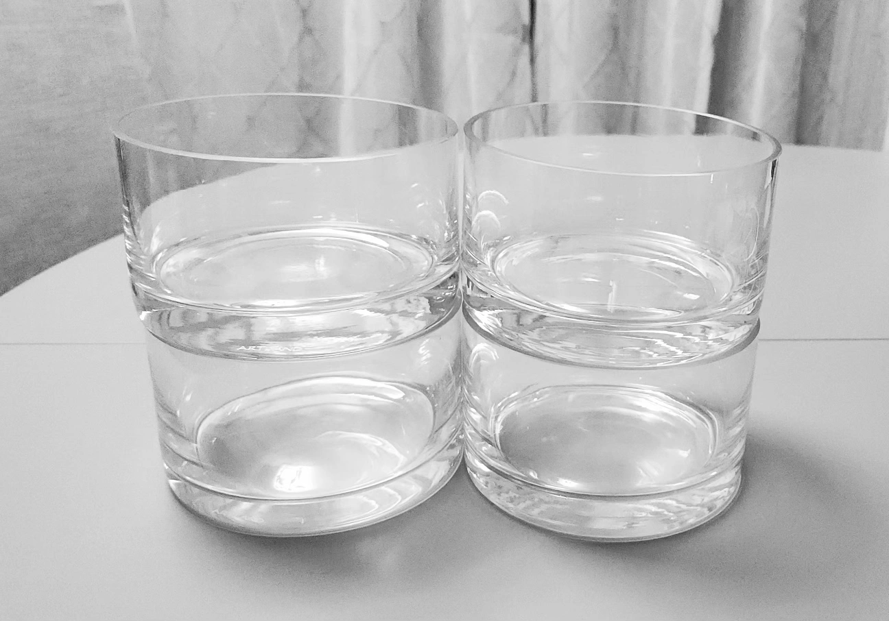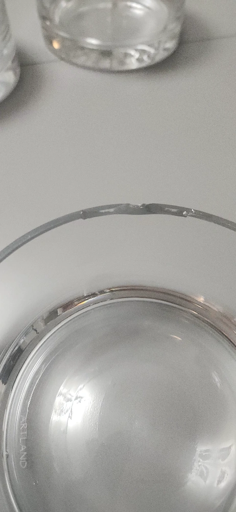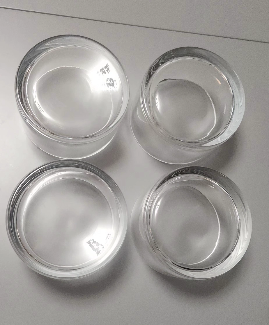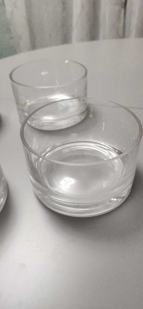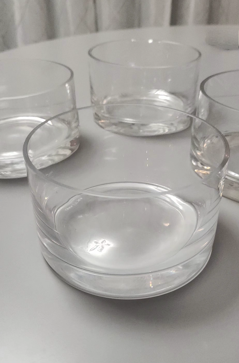 Set of 4 handblown glass serving bowls. Simple cylindrical design offers elegant presentation on your dining table. Bowls have a thick heavy base and thick sides. Perfect for salads, desert or even your morning cereal. Dishwasher safe. Measures 4" high with 5" diameter. 2 bowls are in perfect condition. 1 bowl has a minute chip on the top edge and one has a larger chip (see photos).