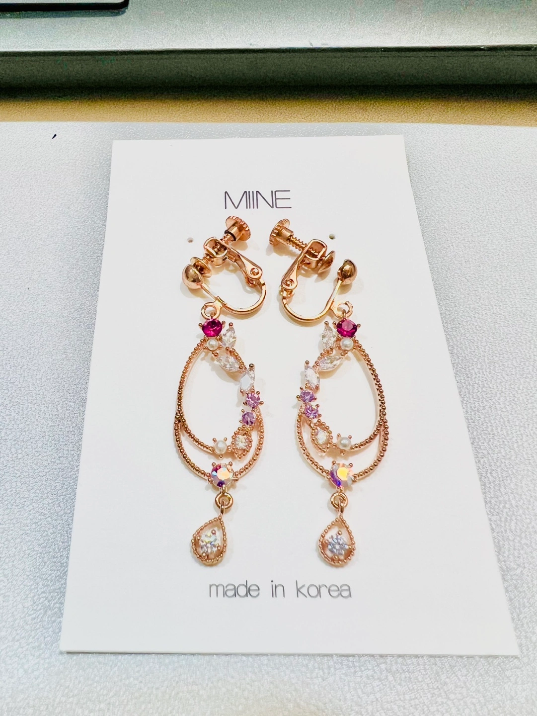 Clip on earrings with gold tone metal, pearls, and pink, white, and purple crystals. Made in Korea.