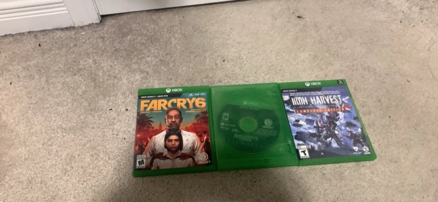 Three Xbox One games. Far Cry 6, Assassin's Creed Valhalla, and Ninth Harvest. All games are in good condition, including the cases and discs. They have all been tested and work perfectly. Far Cry 6 - $23 Iron Harvest - $23 Assassin's Creed Valhalla - $23