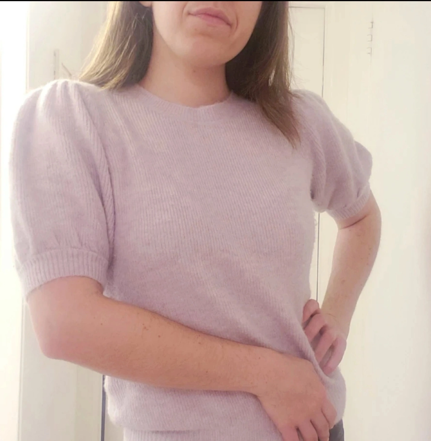 This is an extra comfy and cozy barely worn sweater with a slight puffy sleeve that has an 80s feel. It is a size medium but there is a lot of stretch that it could be snug on a large and fit fine. I have a 31 inch waist and I find it very roomy and loose. This top is good for cool fall and spring days and fluffy enough for winter. I would advise to not tumble dry to maintain shape and softness of the fabric.