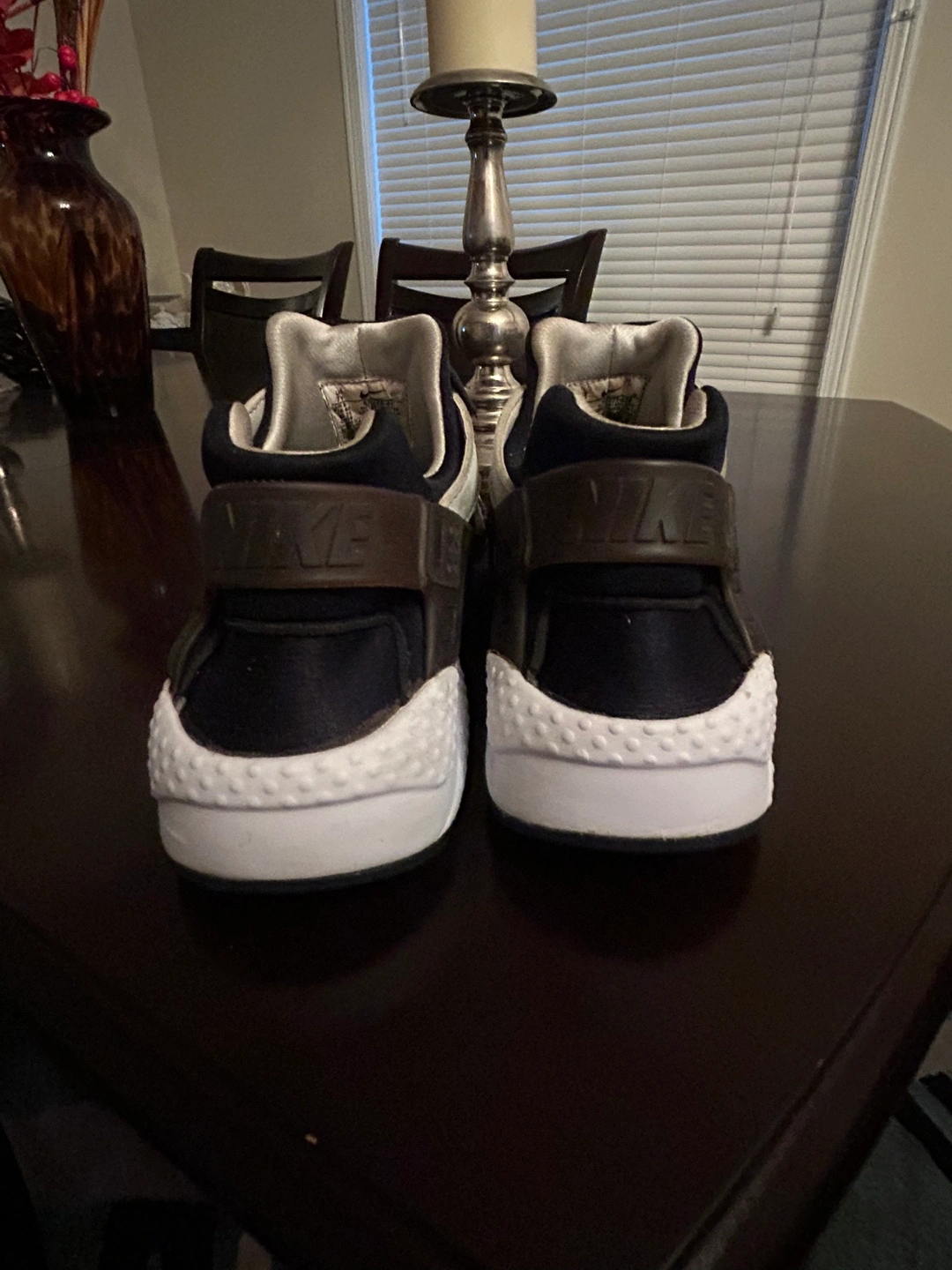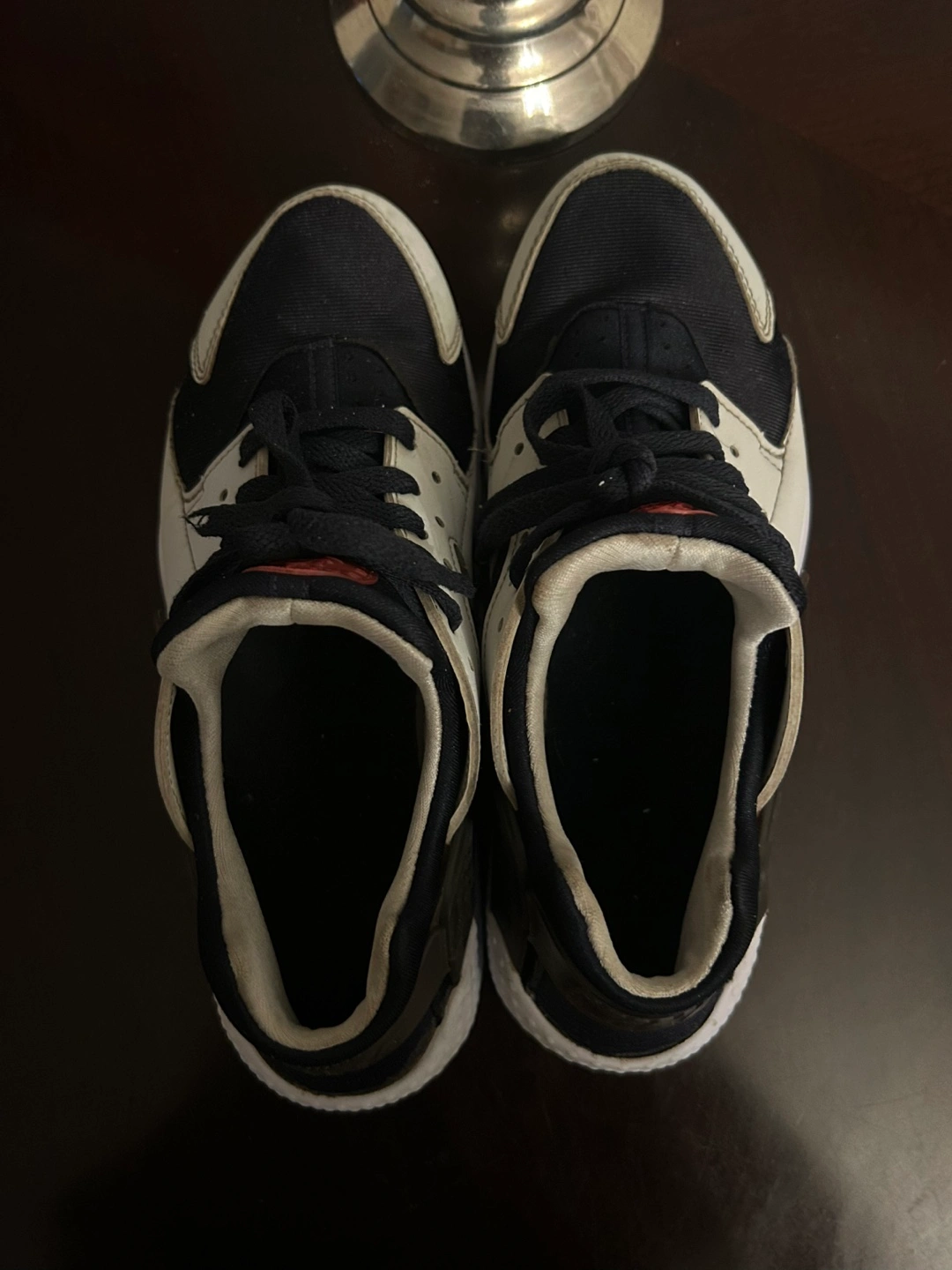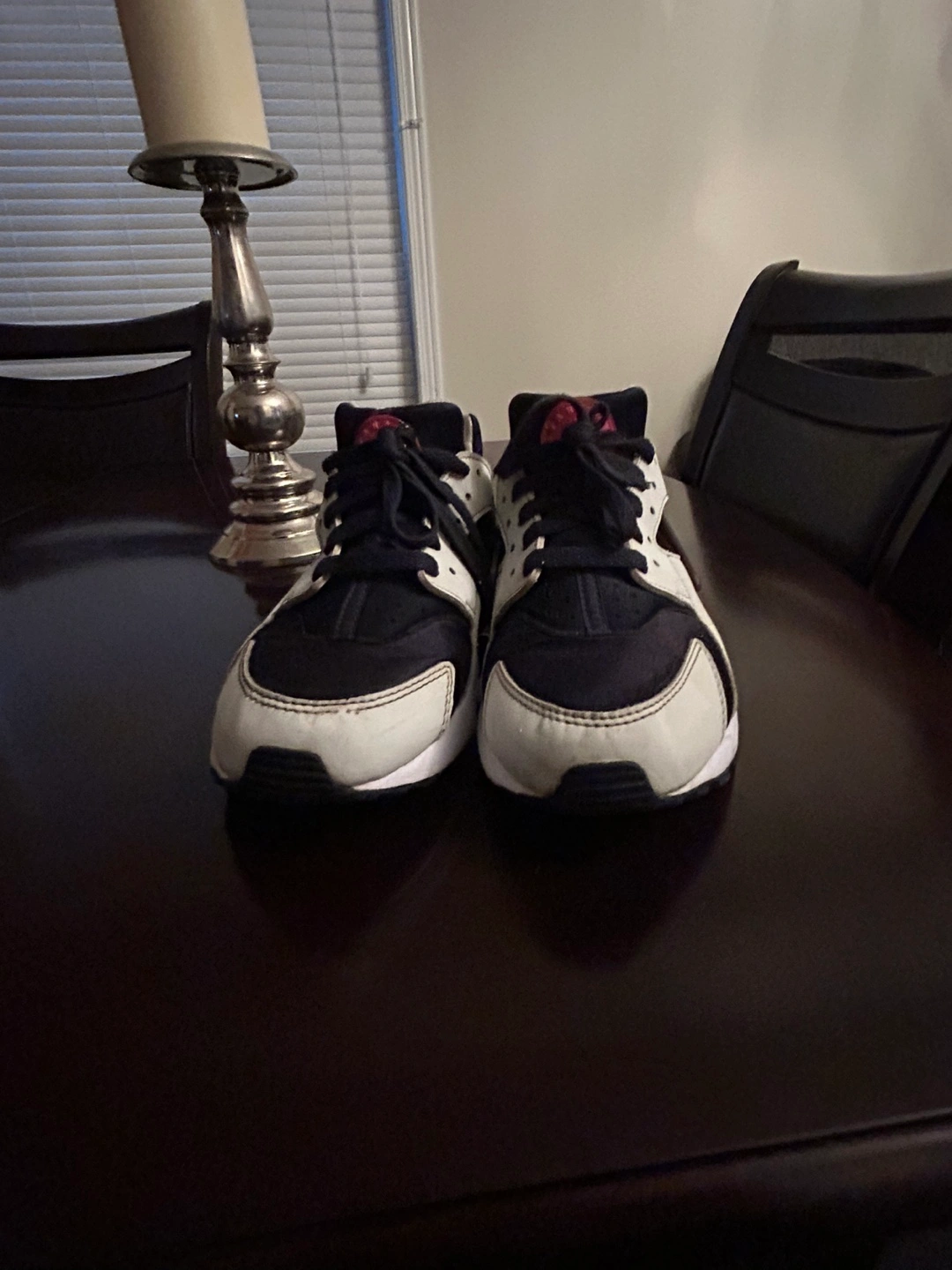 Black, white, and brown running shoes with red laces. Size 7